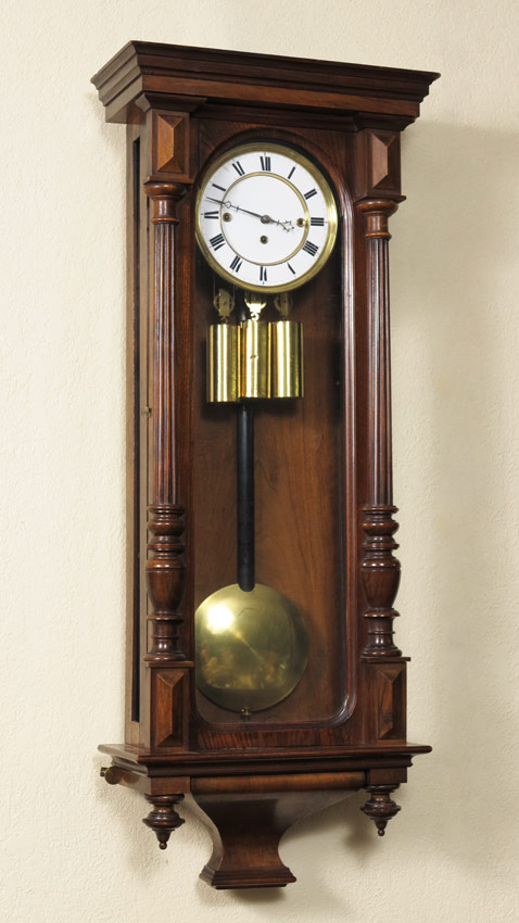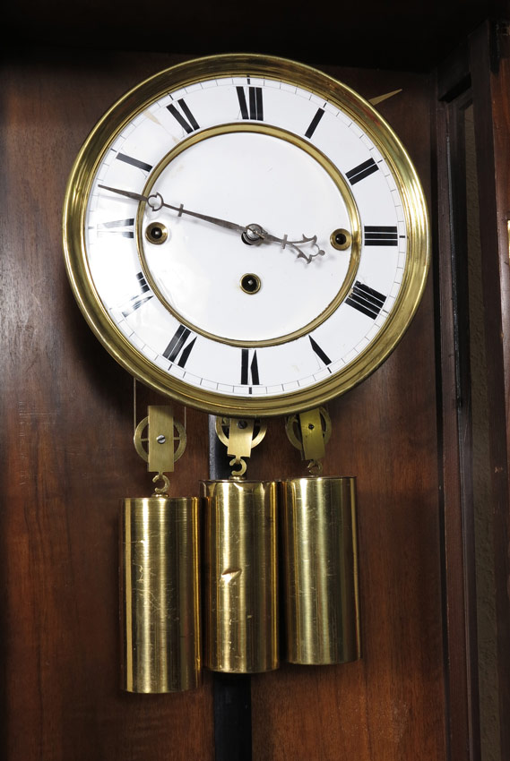 TRIPLE WEIGHT VIENNA REGULATOR CLOCK: Wood case with applied half column decoration, triple weight time and strike movement with unknown makers monogram CKU? on back of movement. Porcelain dial with Roman numerals. Crank in office. Overall 38 1/4'' x 15 1/2'' x 7''.