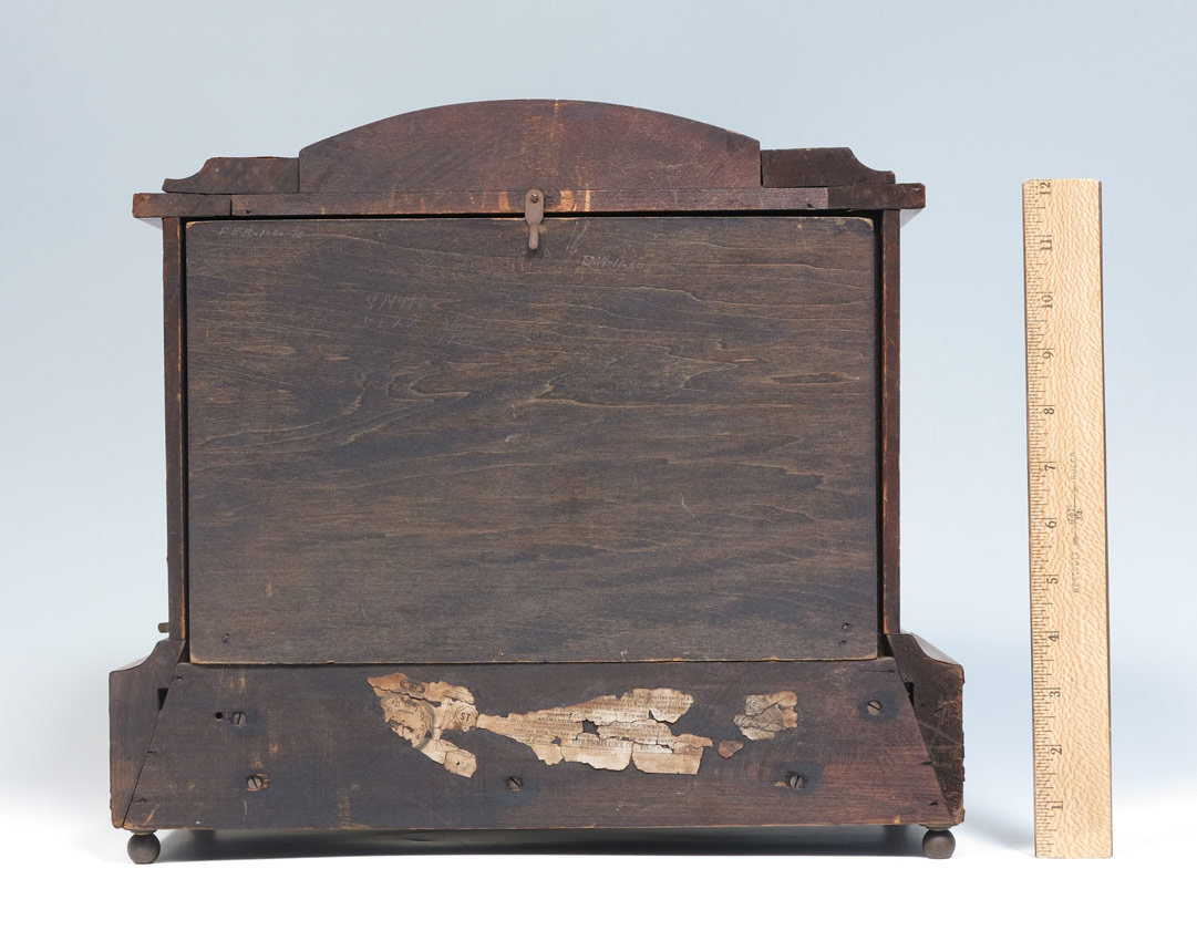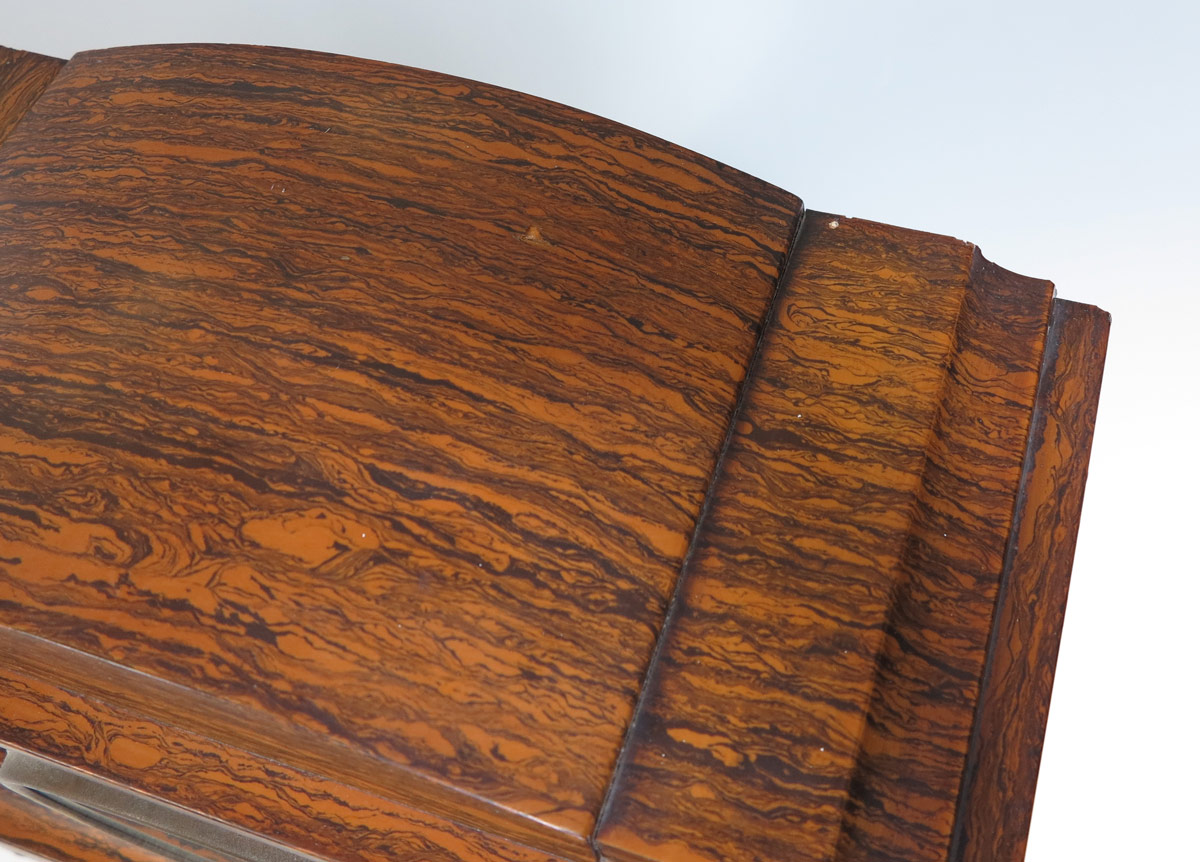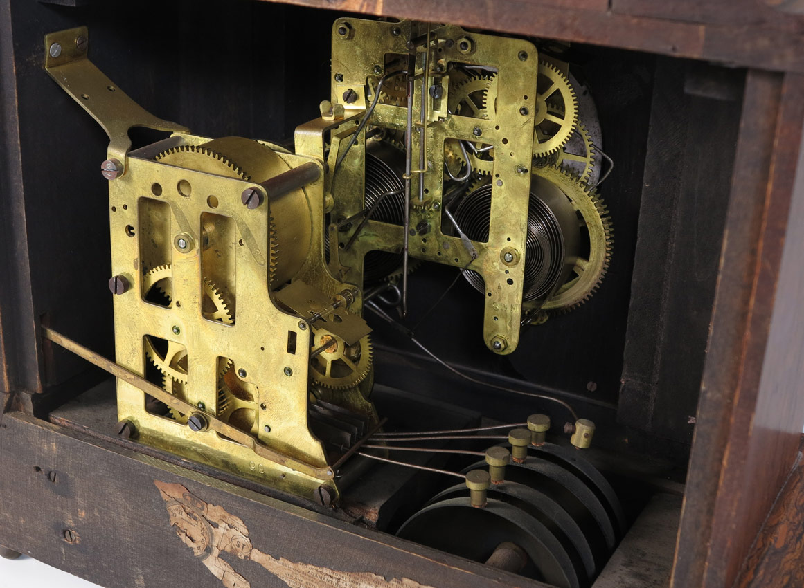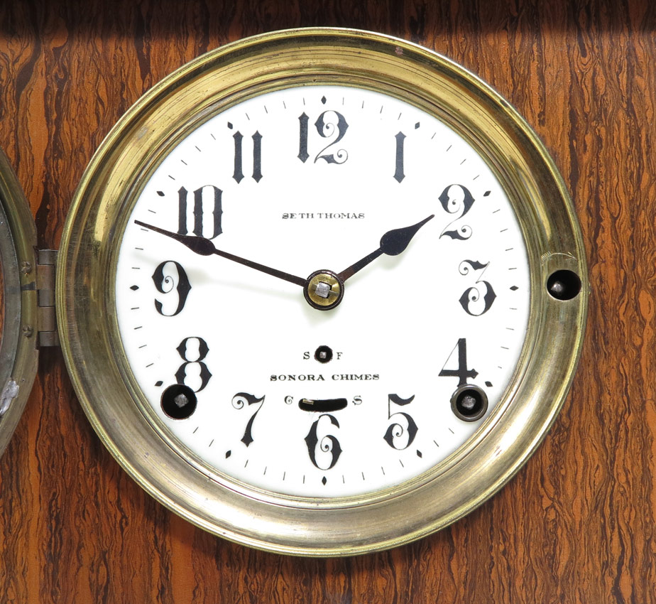 SETH THOMAS SONORA CHIMES MANTLE CLOCK: Adamantine finish case, porcelain face with Arabic numerals signed Seth Thomas, Sonora Chimes. Key and pendulum in office. 13 3/4'' h. x 15'' x 7''.