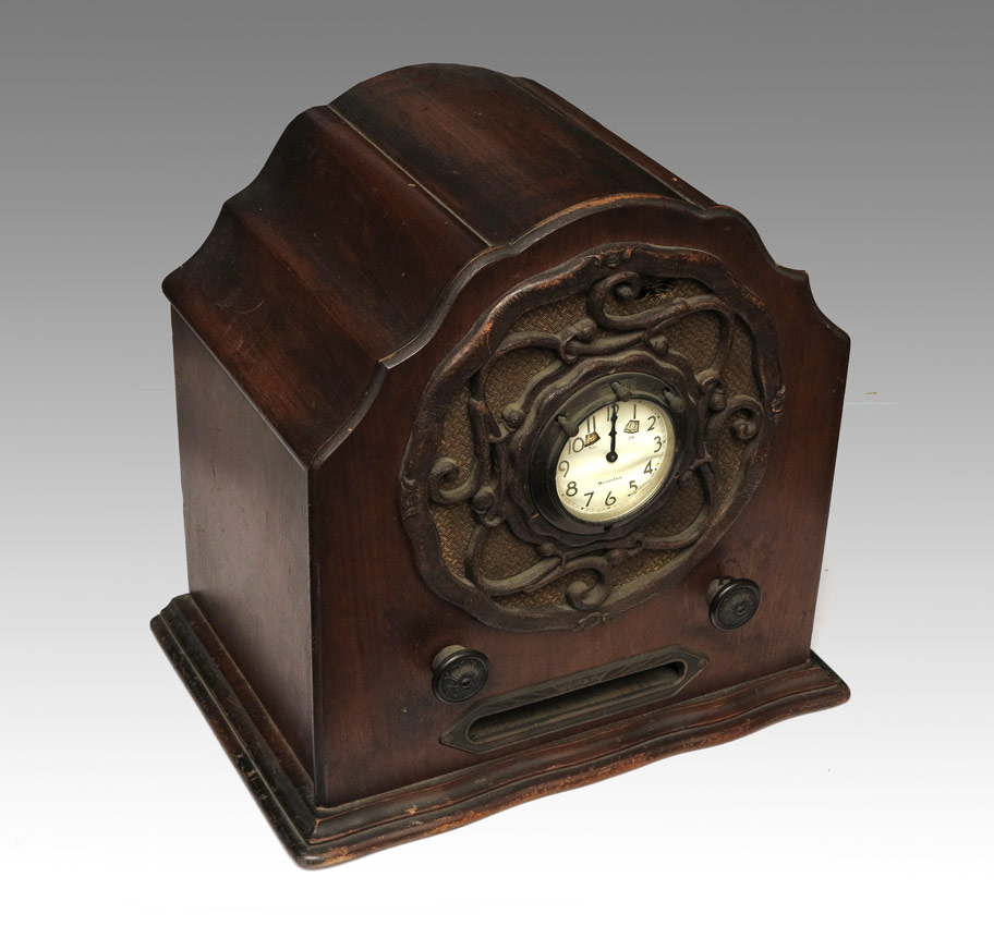 WESTCLOX CARVED WOOD CASE CLOCK RADIO: Shaped wood case, speaker with applied carved wood decoration. Central clock with alarm on and off feature. Two lower knobs on front of case for radio control. Lower plaque missing insert reads ERLA. Jenson Concert Junior model D-15 radio chassis. 13 1/4'' h. x 12'' x 9 3/4''.