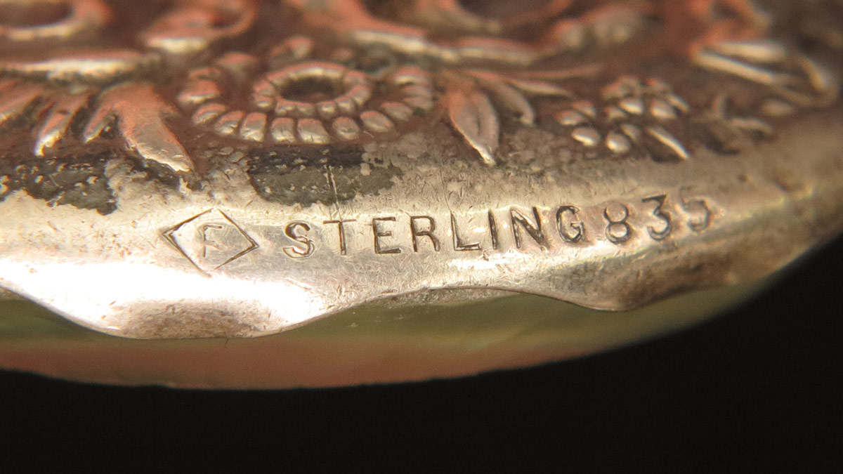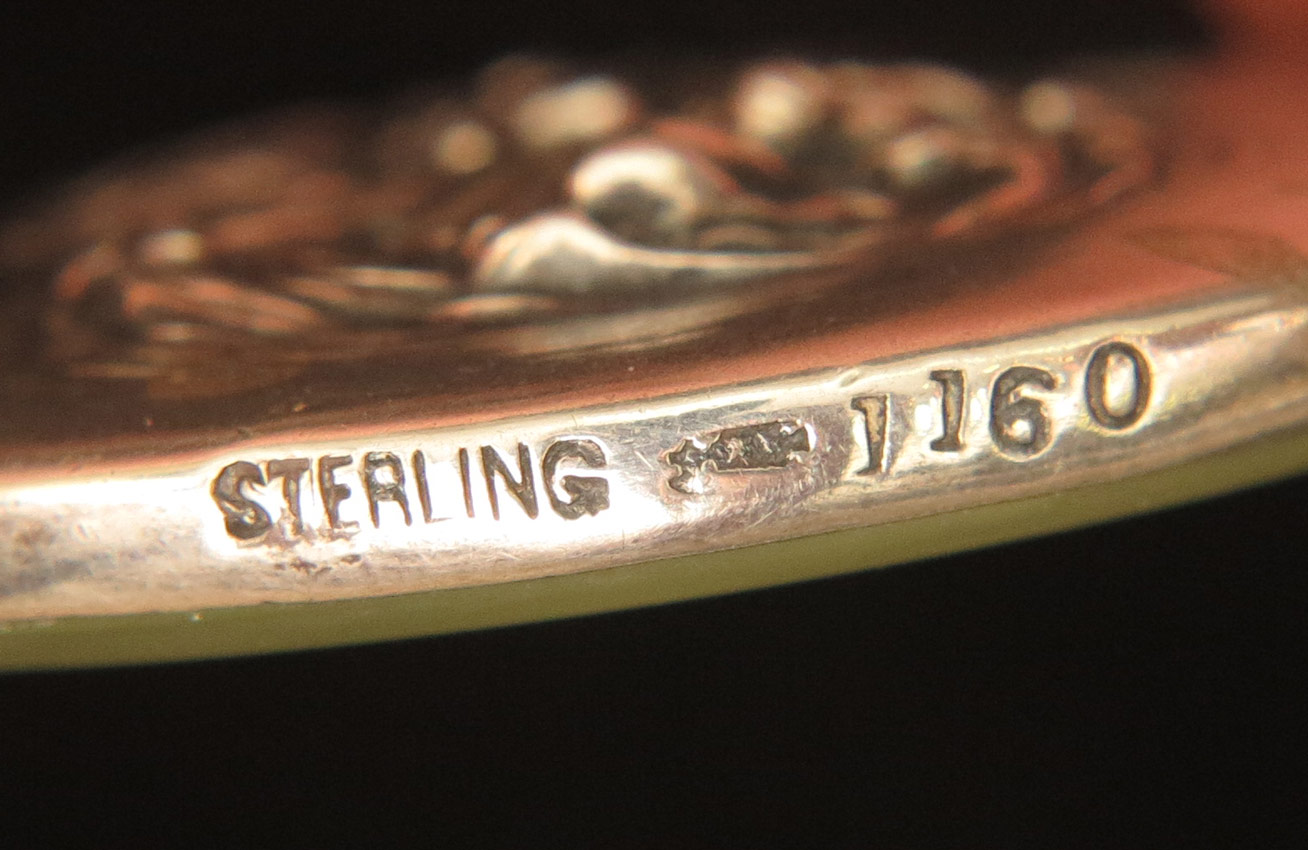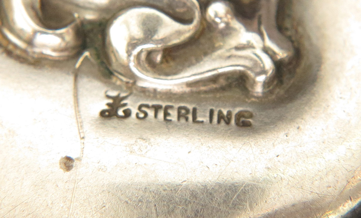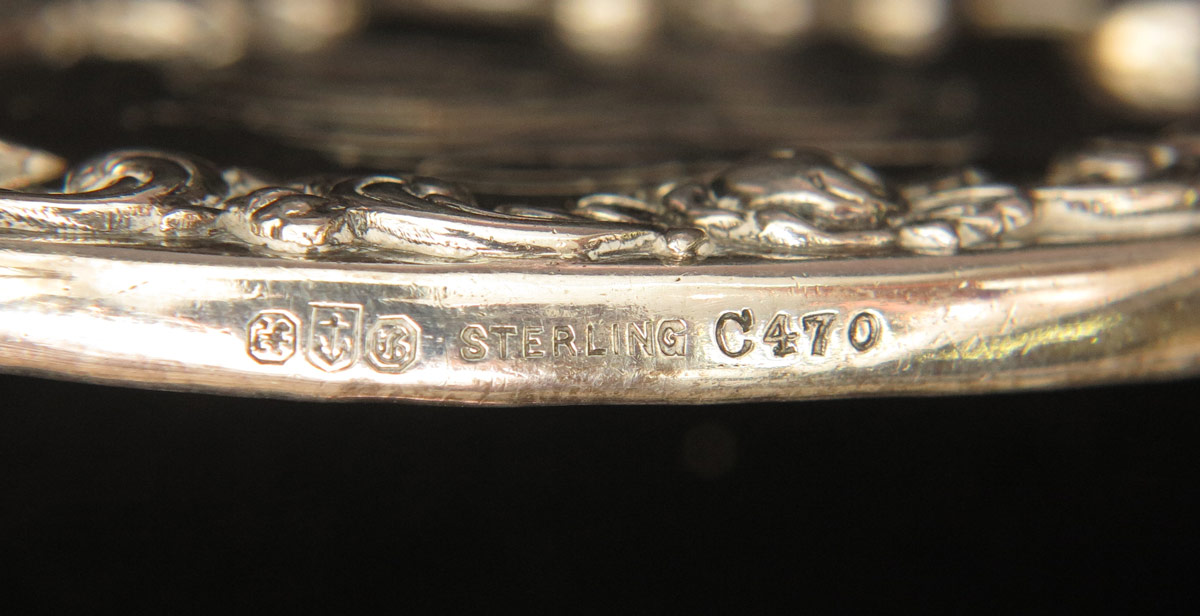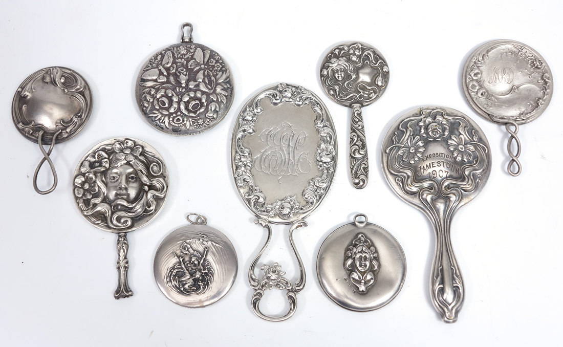 9 ART NOUVEAU STERLING PURSE OR CHATELAINE MIRRORS: 9 pieces total to include 1) 3 chatelaine mirrors; Kerr women in water, La Pierre masqueron face and unknown F in diamond foliate and butterfly motif (1 7/8'' dia.) 2) Purse mirror marked Exposition Jamestown 1907. 3) Gorham foliate rim, monogrammed, (4 1/2'' l.). 4) Sterling woman's face in center. 5) Sterling with woman's face on left of center, (metal not glass mirror). 6) La Pierre woman's head on top, twist handle. 7) La Pierre floral with unusual finish, twist handle, monogrammed.