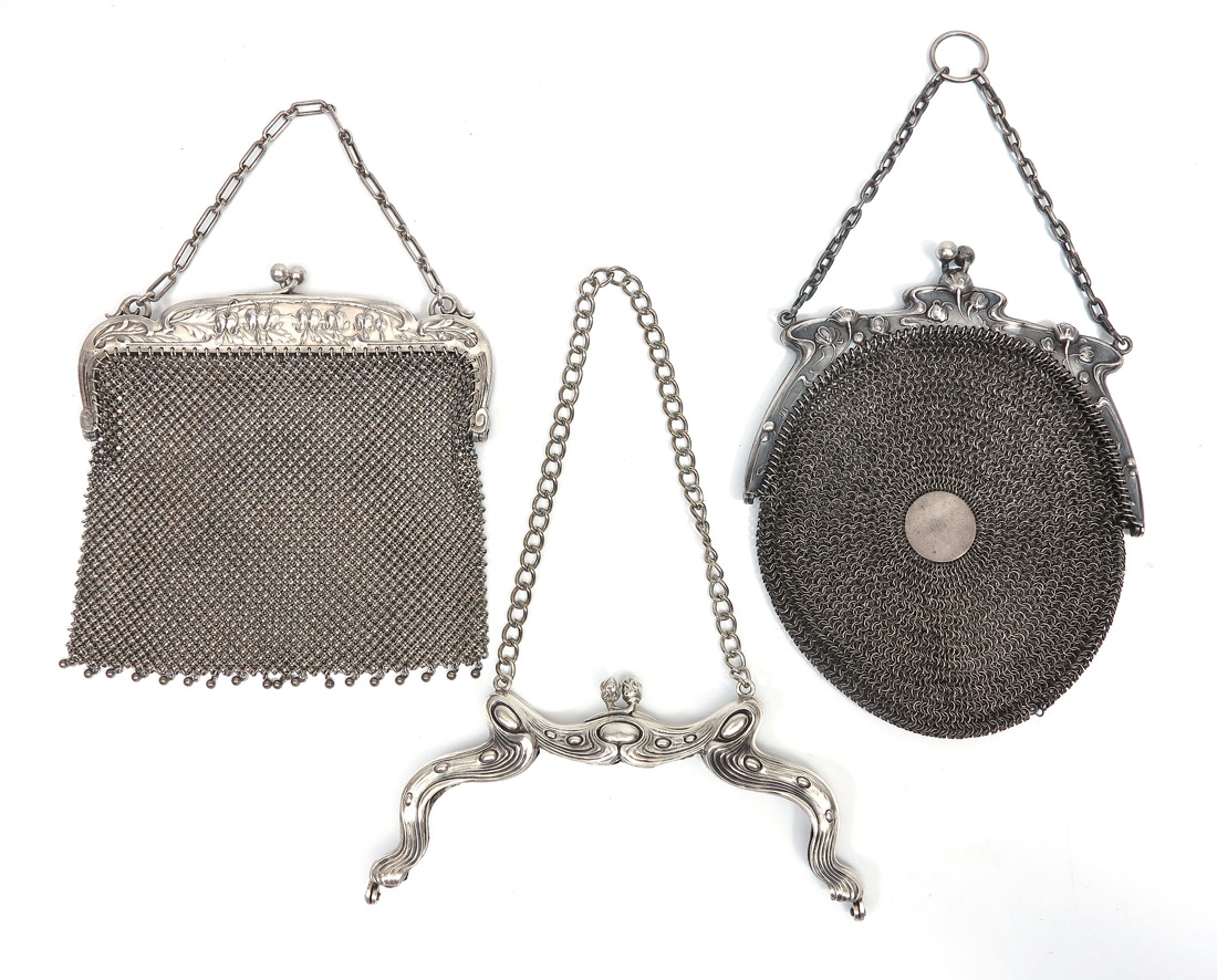 3 PIECE ART NOUVEAU STERLING PURSES: 3 pieces total to include 1) Sterling frame mesh purse, vine and flowers motif. Several previous owners names inside frame. 5'' x 4 3/4''. 2) Sterling frame bull's-eye shape mesh purse, floral motif frame. 3) Sterling frame only with art nouveau lines.