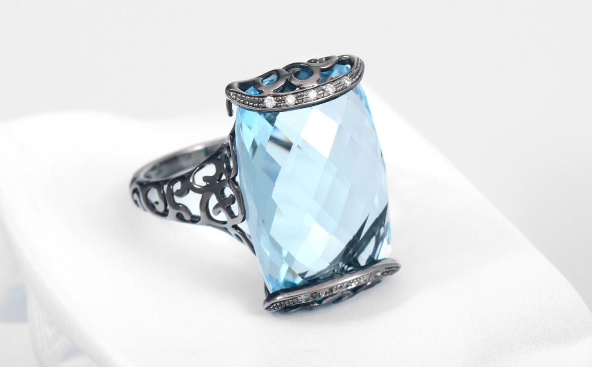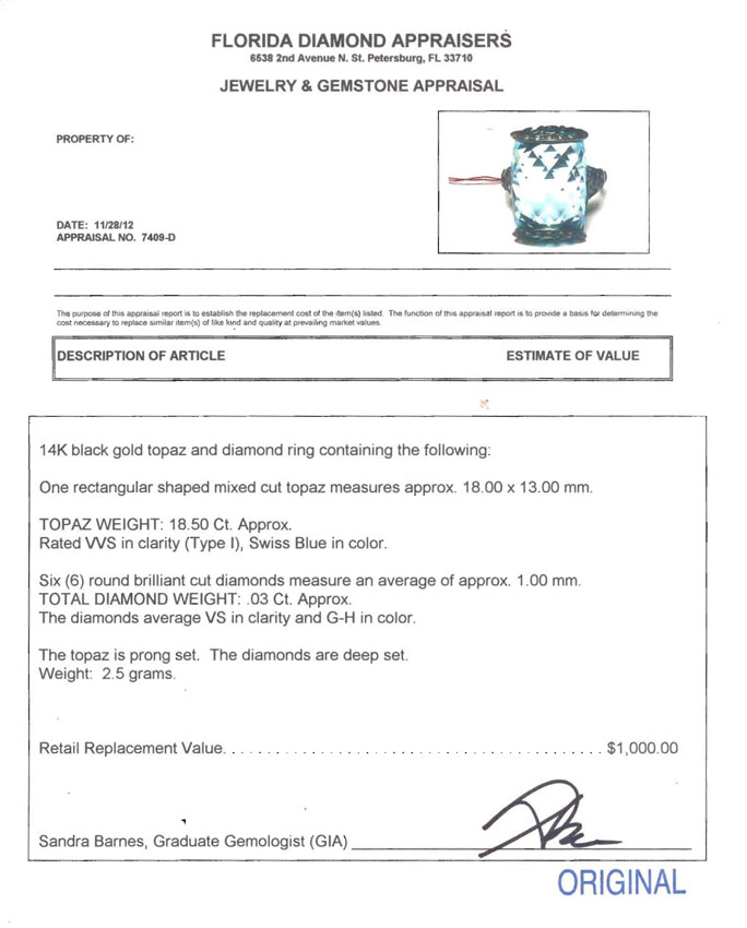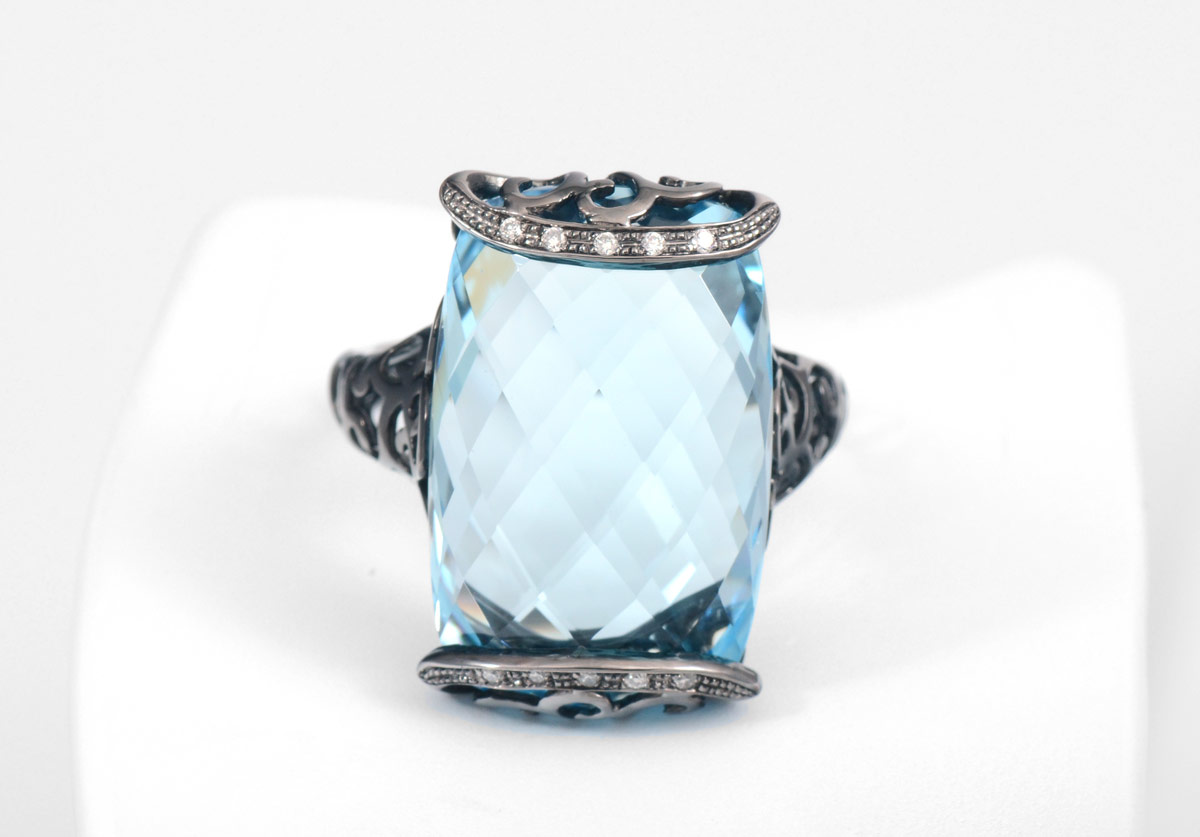 14K BLACK GOLD SWISS BLUE TOPAZ & DIAMOND RING: Centering an approx. 18.50 Ct rectangular mixed cut blue topaz, VVS in clarity. The black lace filigree setting is studded with 6 round brilliant diamonds totaling .03 Ct., averaging VS in clarity and G-H color. Topaz is prong set, diamonds deep set. Size 6.5. Weight 2.5 grams. Sold with current Florida Diamond Appraisers GIA graduates appraisal for $1000.
