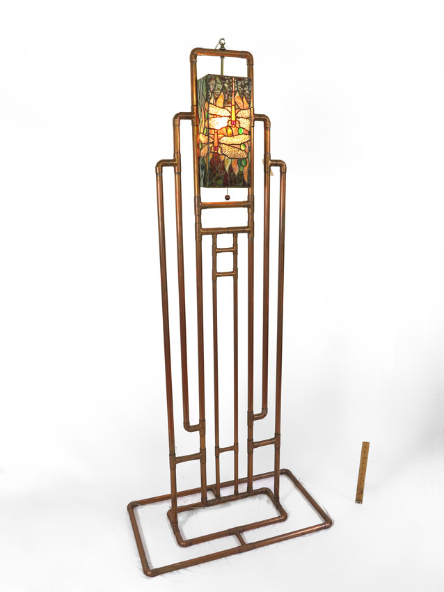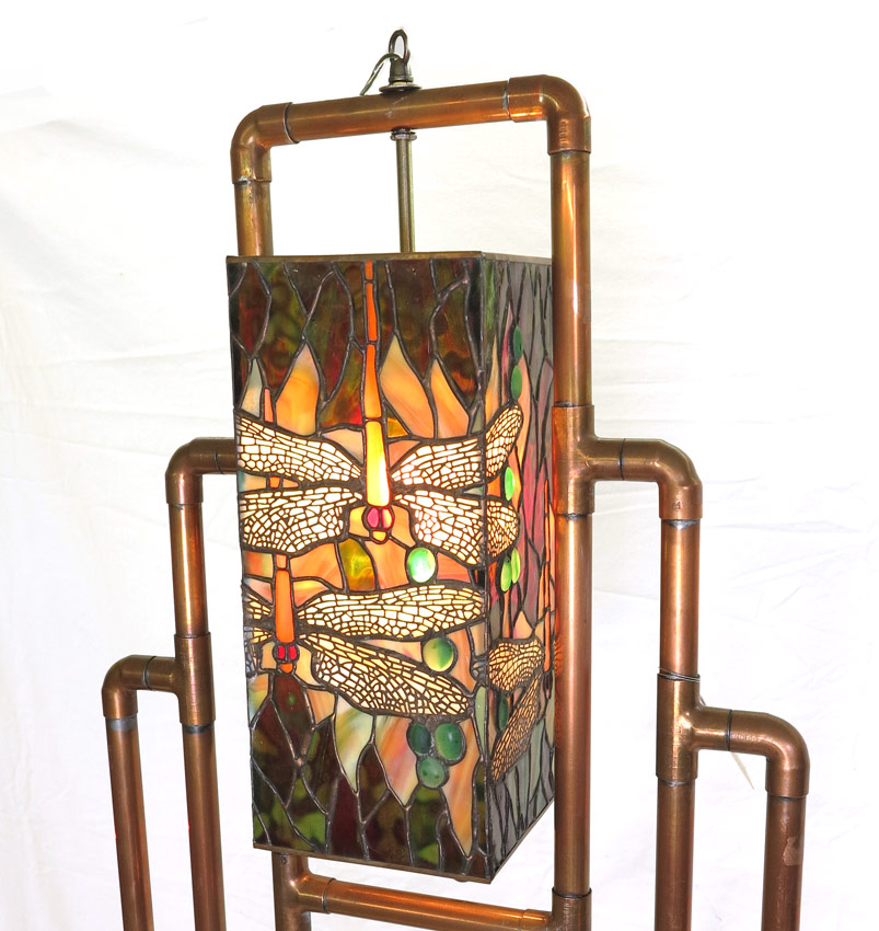 RIVERBEND STUDIOS COPPER & LEADED GLASS LAMP: Designed by Riverbend Studio's, Denver, Colorado. Single light with dragonfly motif shade. 72 3/4'' h. x 30 1/2'' x 16 3/4''.