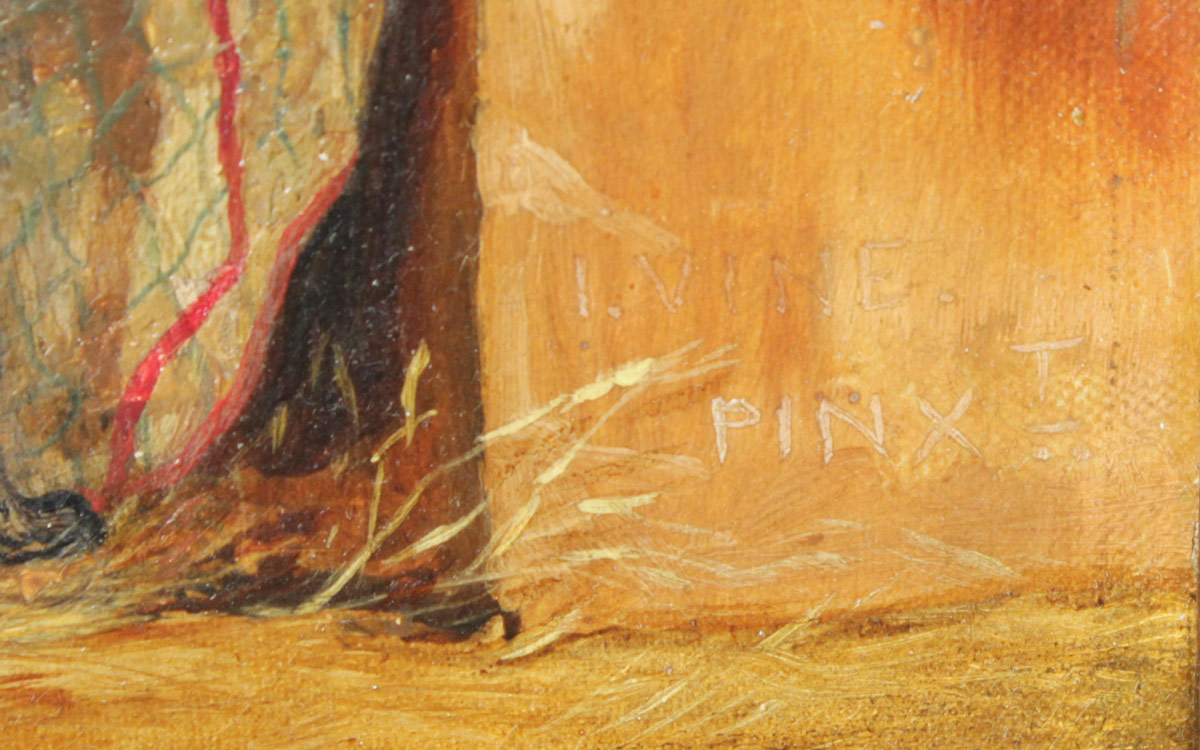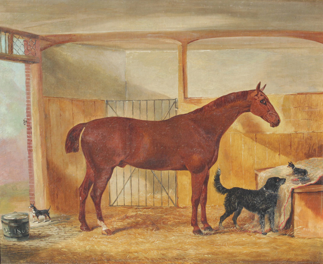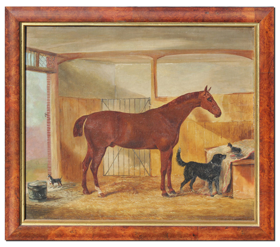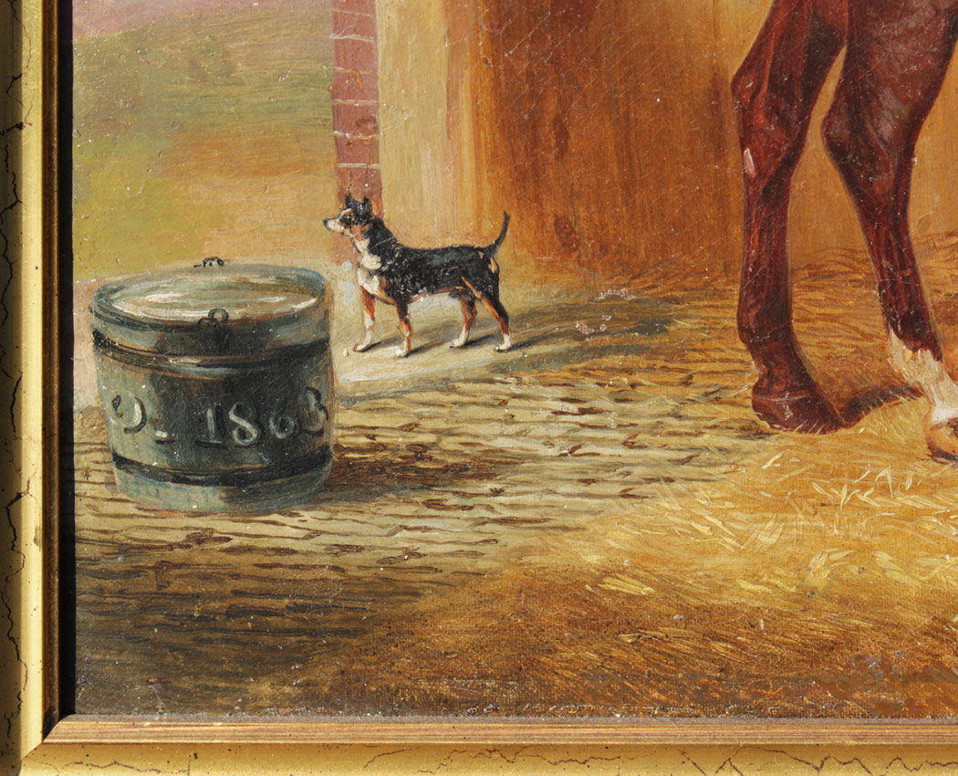 VINE, John, (English, 1809-1867): Stable Scene with Stallion, 2 Manchester Terriers, and Mutt, Oil/Canvas, 20'' x 24'', signed lower right, dated 1863 lower left, contemporary burlwood fine framing 23 1/2'' x 27 3/4''.