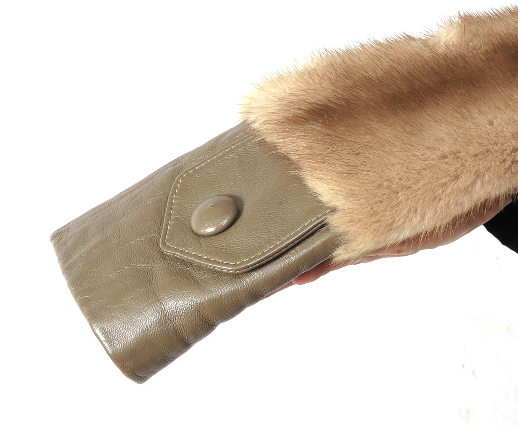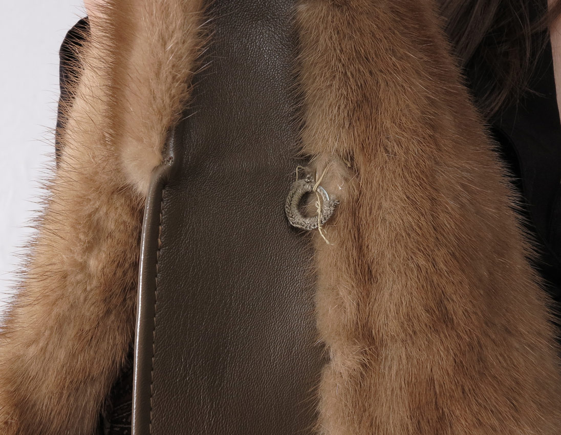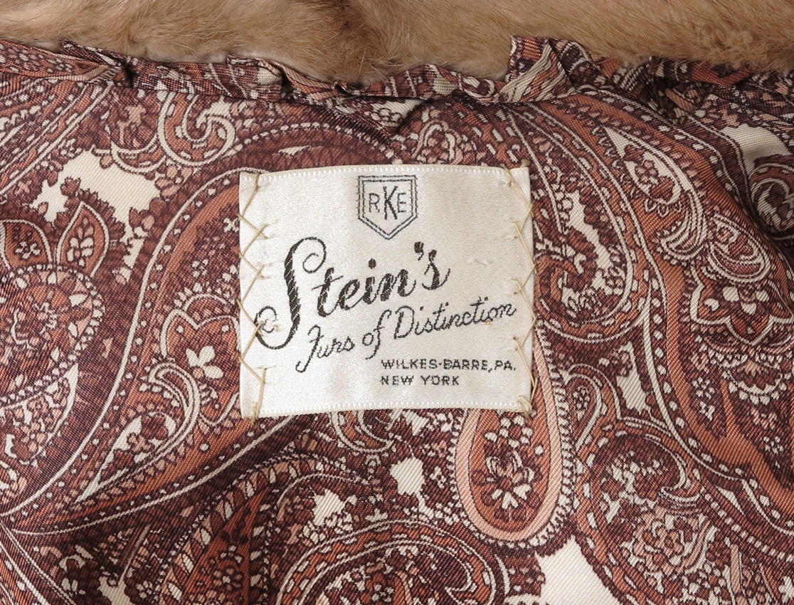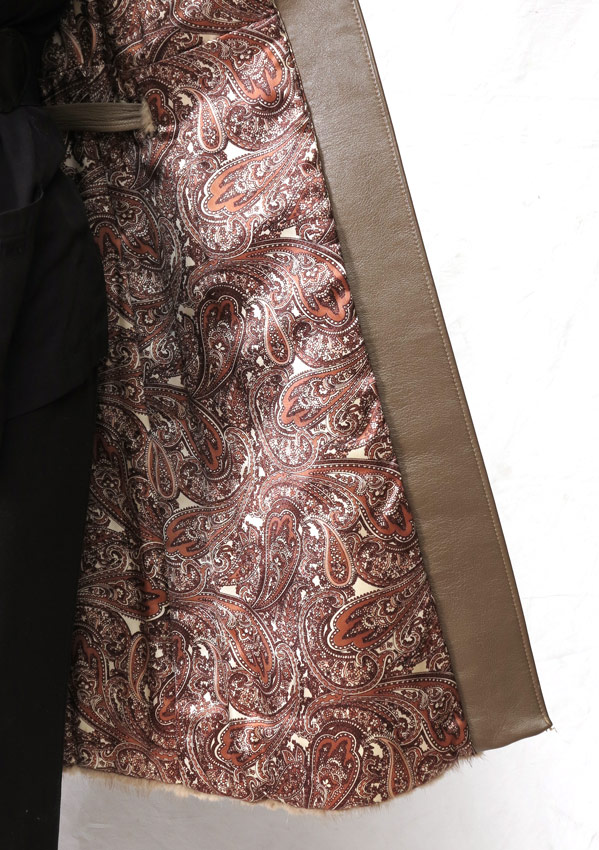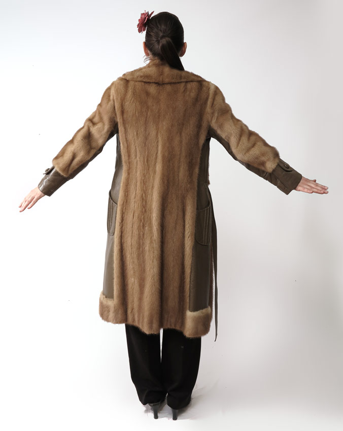 VINTAGE 1970'S MINK & LEATHER COAT: Mink with leather side panels, tie belt and cuffs. Length approx. 41''. Cool paisley lining. Steins Furs of Distinction, Wilkes Barr PA label.