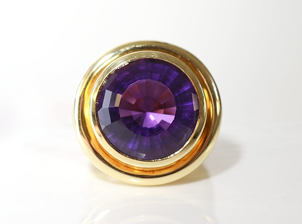 18 KT 11.25 CT AMETHYST RING: 18K yellow gold ring very much in the manner of Paloma Picasso for Tiffany featuring an approx. 11.25 Ct round brilliant cut amethyst. Unsigned. Size 6. Weight Approx. 26.7 grams.