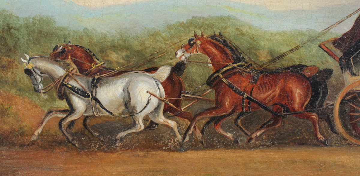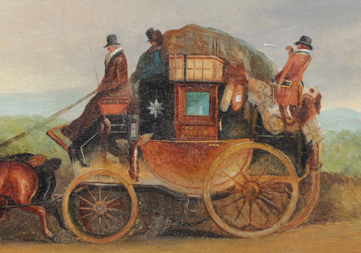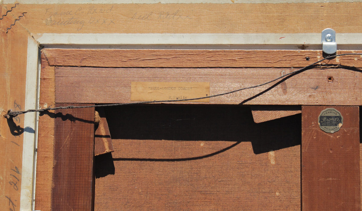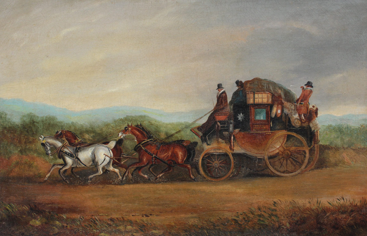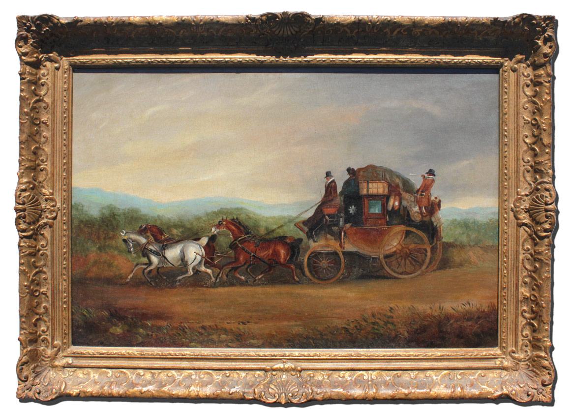 HULL-LONDON COACH PAINTING BY H HAMLIN: Oil/Canvas, 12 1/2'' x 20'', signed lower right, label affixed verso, encased in gilded gesso frame 19'' x 25 1/2'', circa 1850.