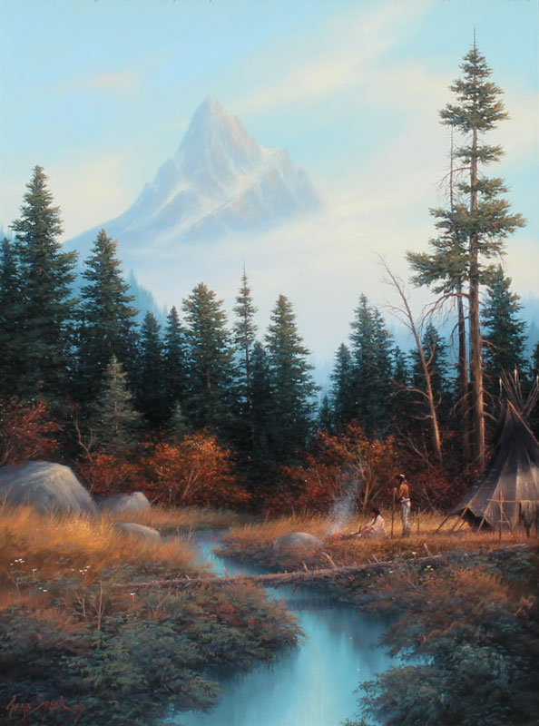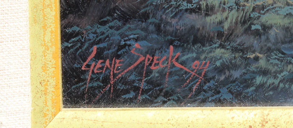 SPECK, Gene, (American, 1936-): ''Autumn on the Mountain'', Oil/Masonite, measures 16'' x 12'', signed lower left, custom frame, 25 1/2'' x 21 1/2''. Wind River Gallery appraisal from 1995 for $4,800.00, as well as article on Speck from Art of the West Magazine, Sept/Oct 1994.
