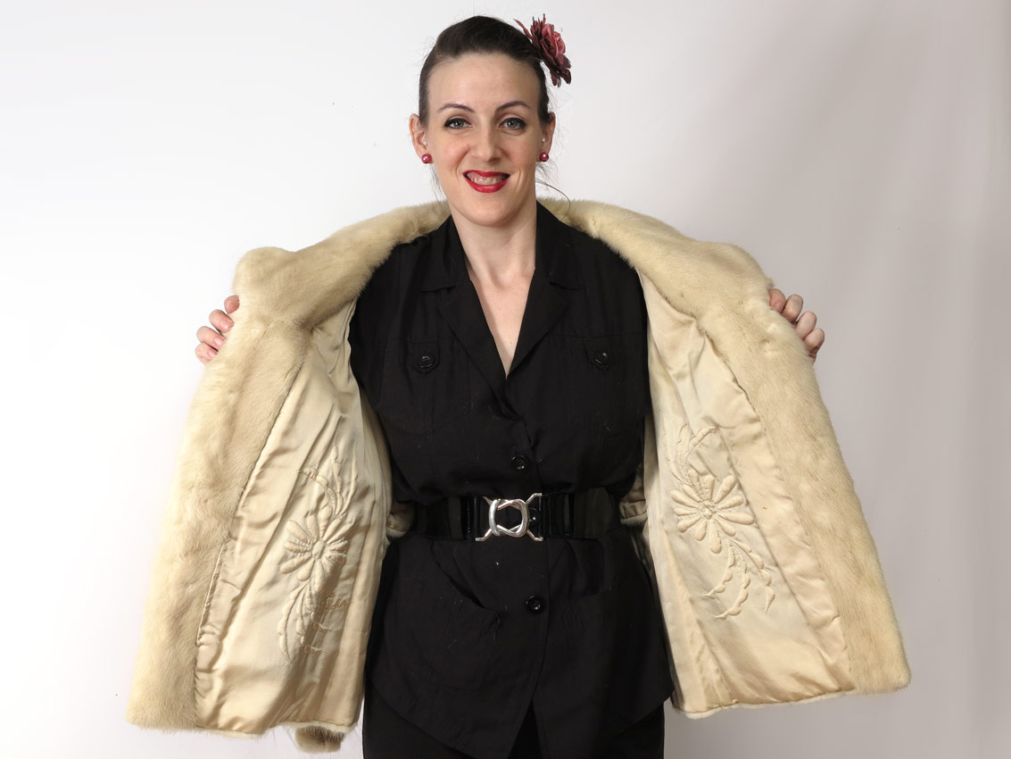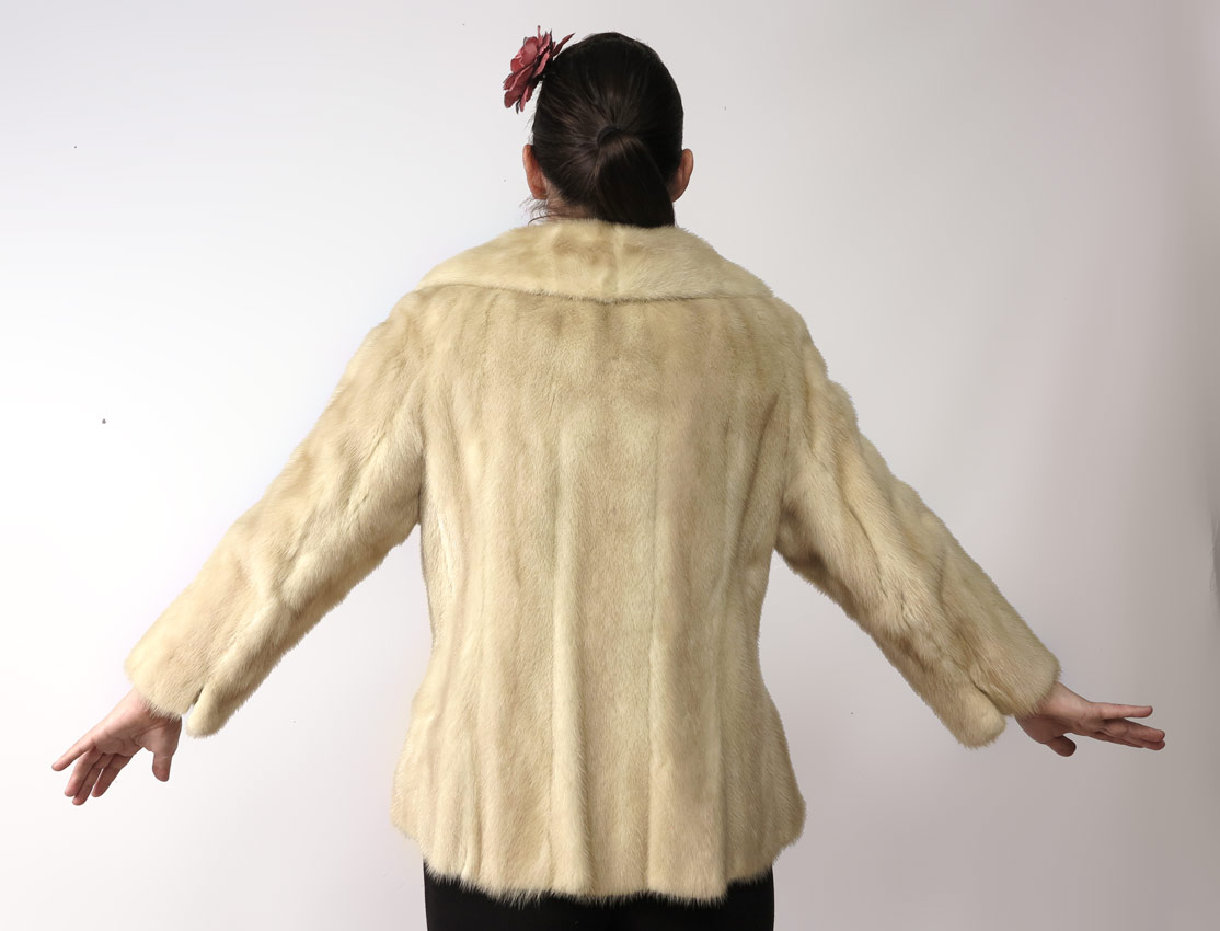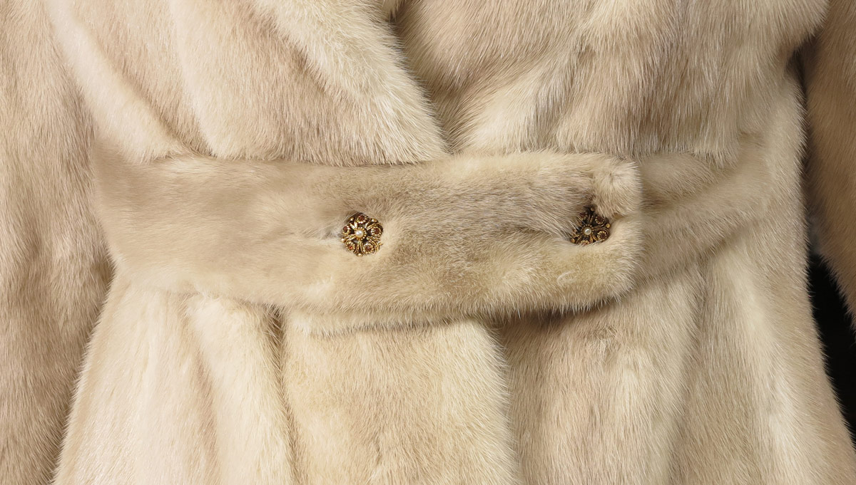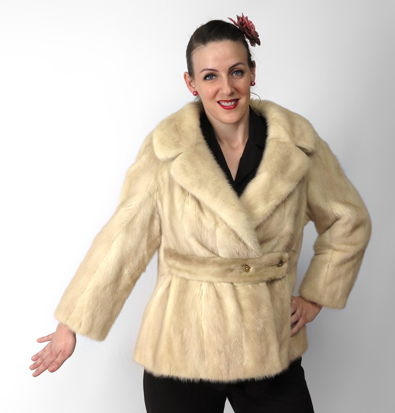 CREAMY DREAMY MINK FUR JACKET: Full length lapel, belt with buttons. Overall length 26''.