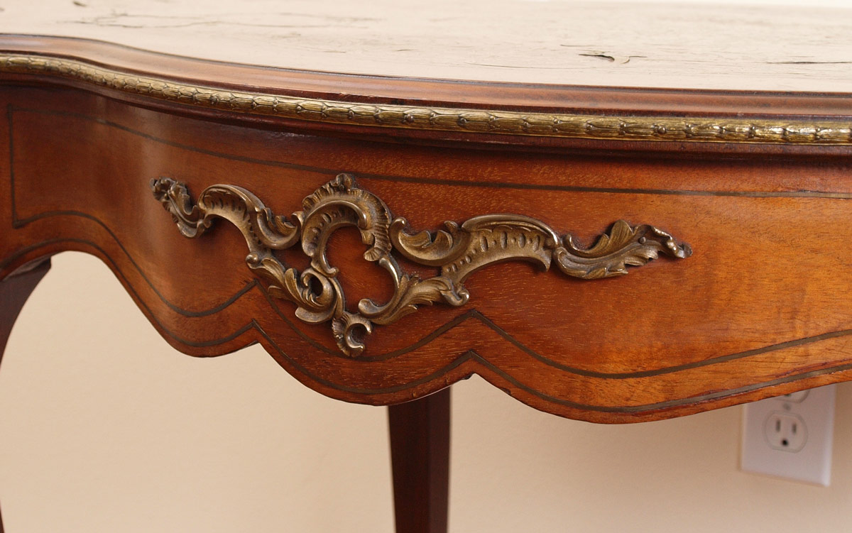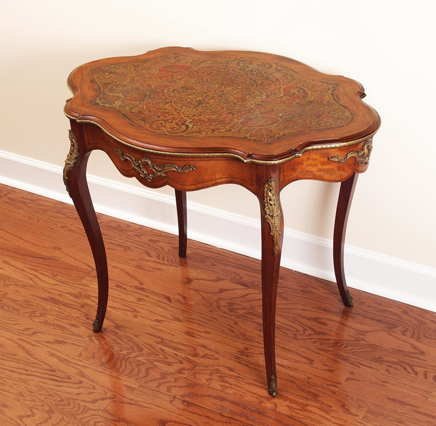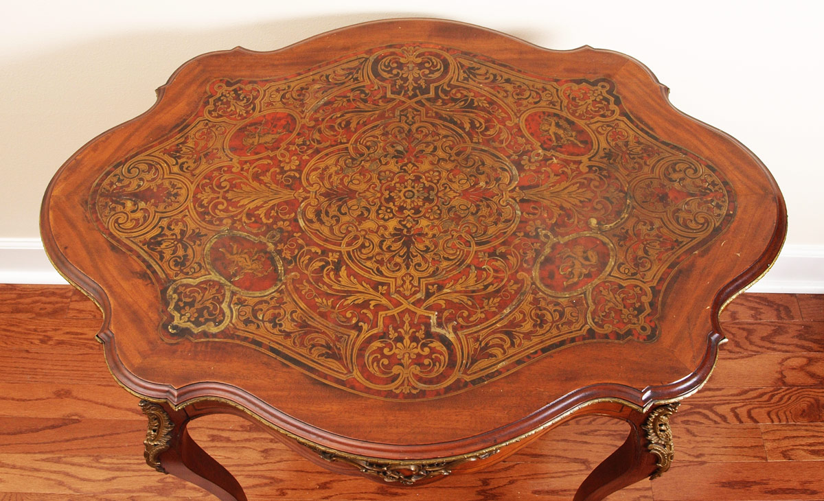 BOULLE INLAID TABLE WITH ORMOLU MOUNTS: Boulle inlay shaped top featuring cherubs and foliate motifs with faux tortoise shell inlay. Ormolu trim and mounts on skirt and shaped legs. 29 1/2'' h. x 36 1/2'' x 26 1/2''.