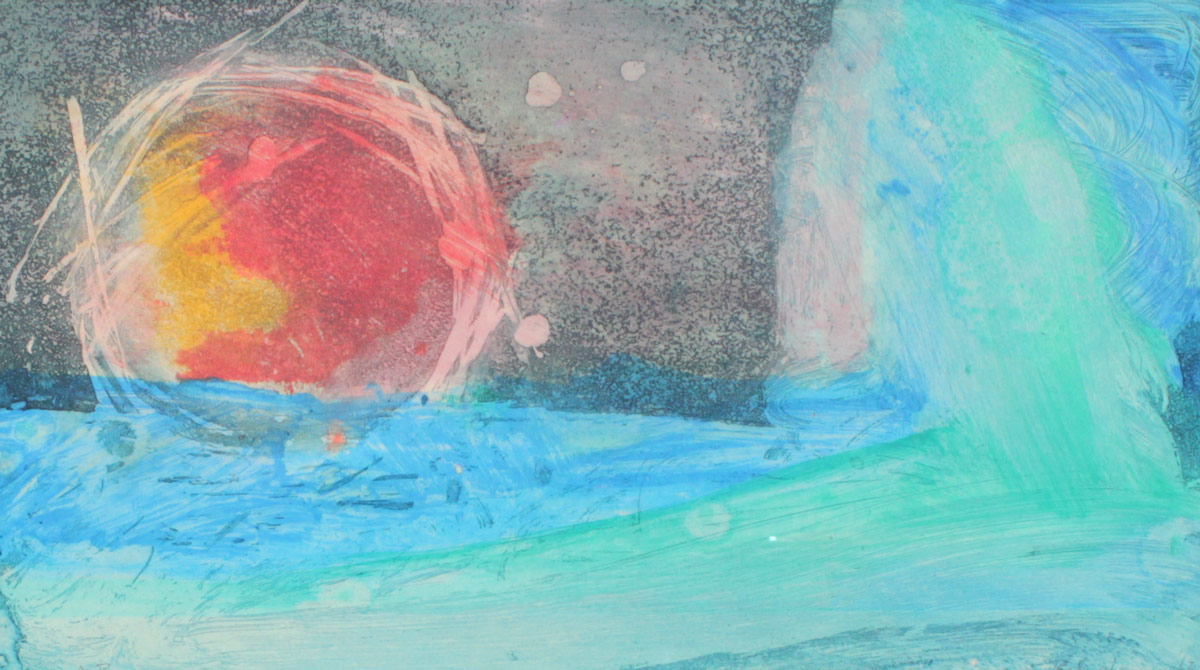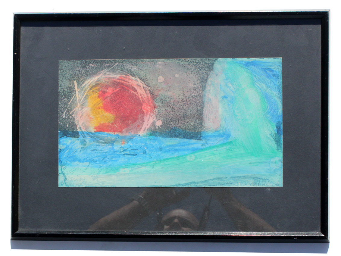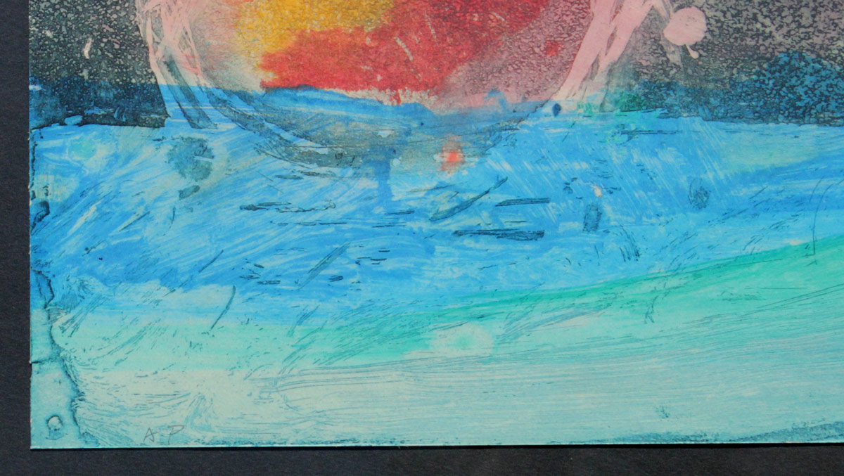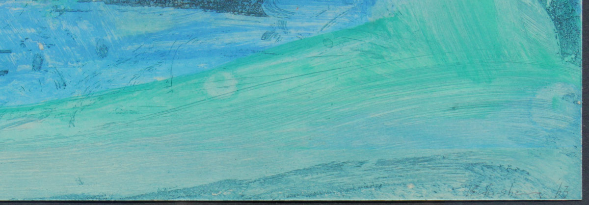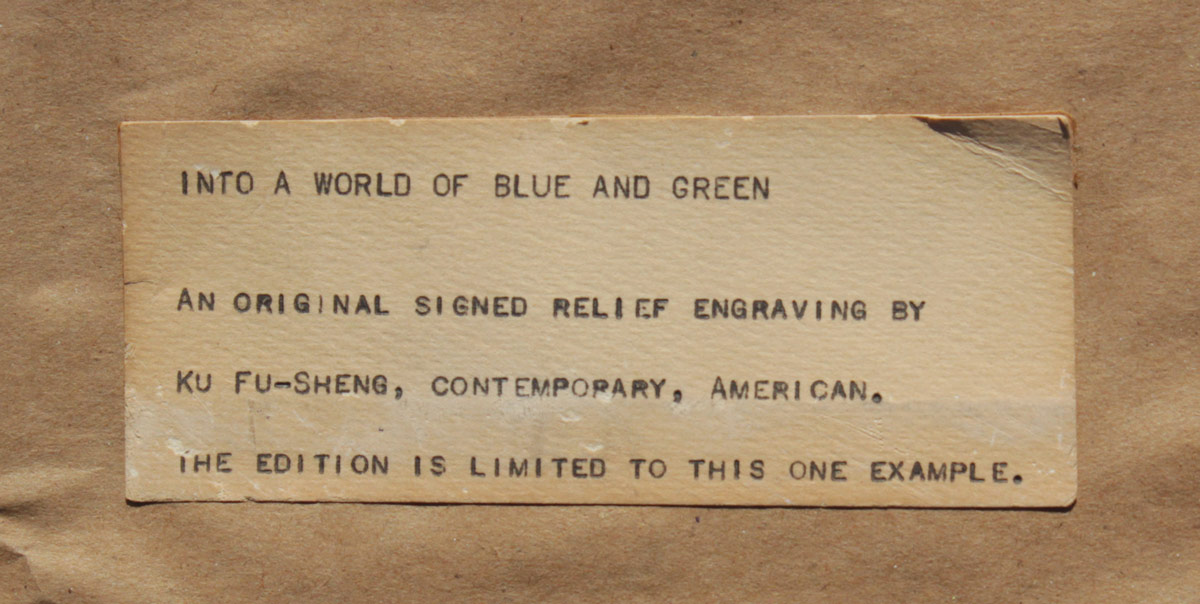 FU-SHENG, Ku, (American, 1935- ): ''Into a World of Blue & Green'', Color Relief Engraving, 7 7/8'' x 13 3/4'', signed lower right, dated '63, marked artist's proof lower left, label verso indicates title, artist, and the fact that this is an edition size limited to this one example, contemporary black painted frame 14 1/2'' x 19 1/2''.