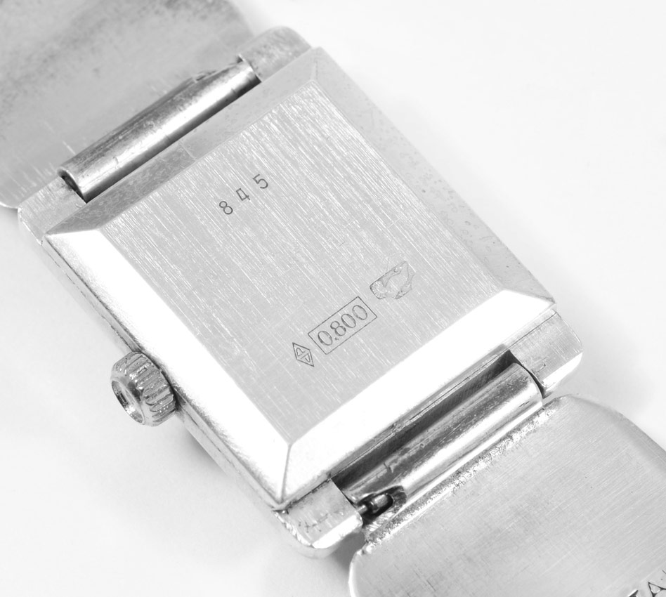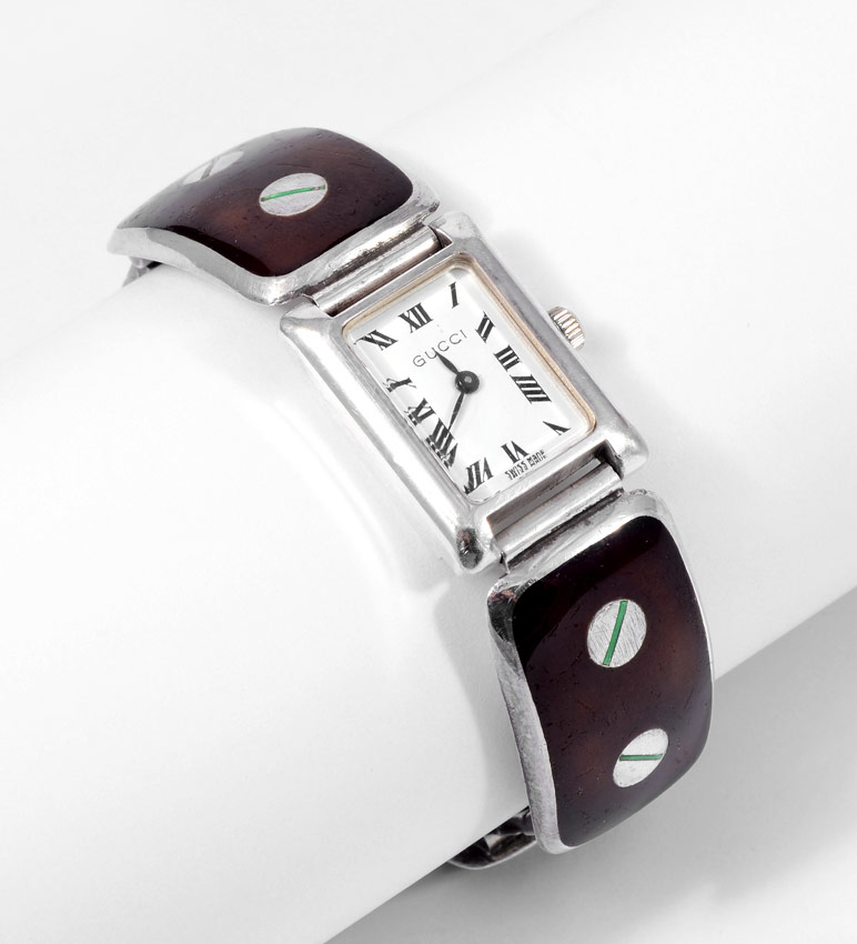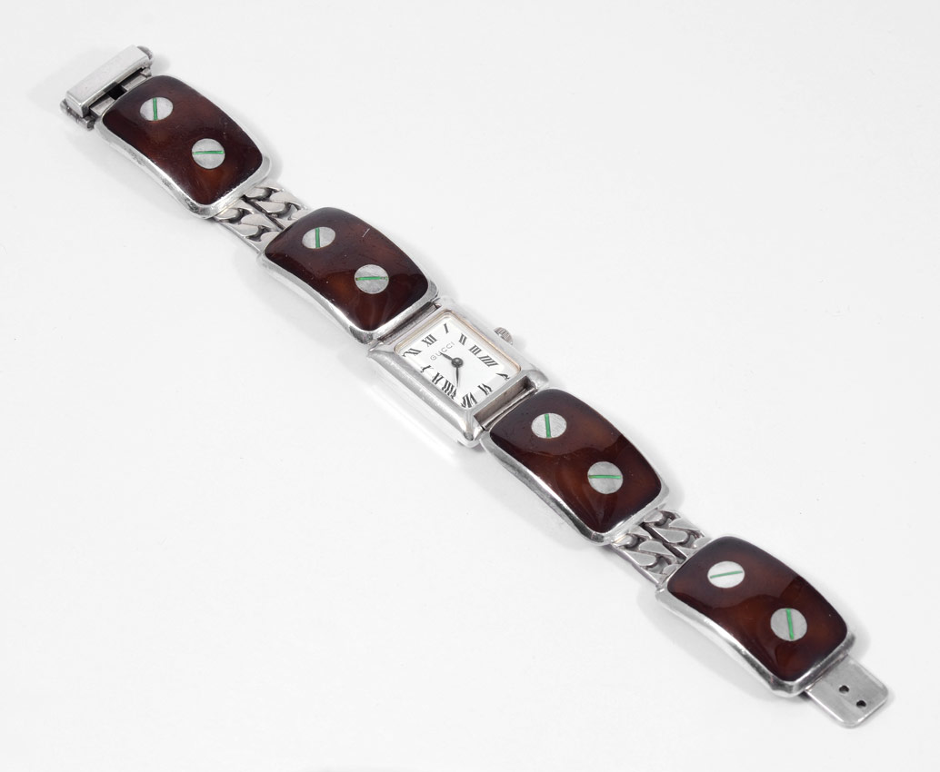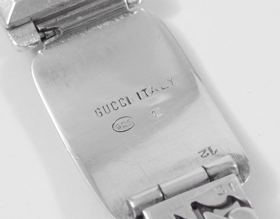 VINTAGE GUCCI STERLING WRISTWATCH: The link bracelet marked Gucci Italy 924, the case is marked 800. Swiss movement in running order. White dial with black Roman numerals. Length 7''. Weight 2.72 troy oz. CONDITION: There are scratches to the enamel.