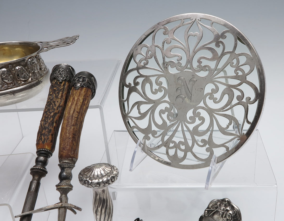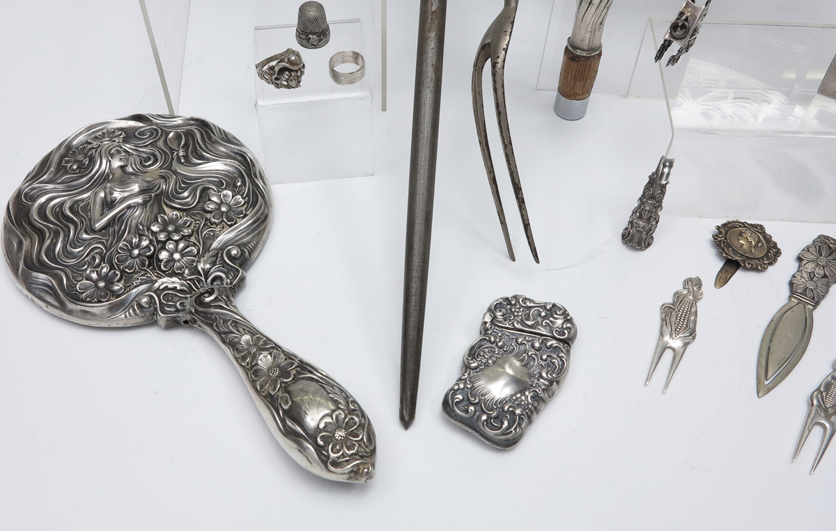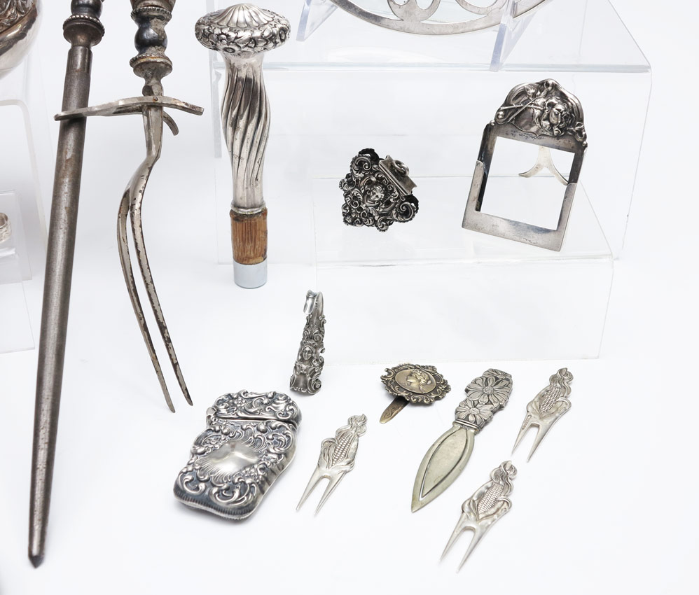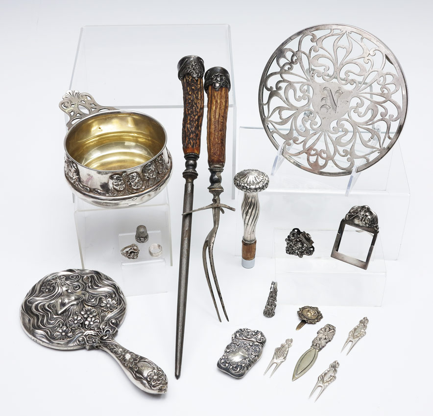 ESTATE COLLECTION OF ART NOUVEAU STERLING ITEMS: An assembled collection of 18 items to include 1) Unger Brothers foliate scroll match safe. 2) 3 Watson corn holders. 3) Gorham porringer with applied vignettes of children, pierced handle. Marked with Gorham mark, Sterling, A4315M, 1903 date mark. 2 3/8'' h. x 7 1/8''. Note pinholes. 4) Shiebler parasol handle, floral repousse rim pommel with left twist design to body. Partial shaft remains. Marked Sterling, Shiebler, 1945. 5 3/8'' l. 5) 2 small bookmarks, larger Webster. 6) Small Woodside calendar frame. 7) 2 rings one size 7 1/2, the other size 3. 8) 2 unknown objets de vertu. 9) Sterling mirror with woman looking at mirror, broken handle. 10) Sterling mounted horn handle carving set, sharpener 15'' l. 11) Graff, Washbourne & Dunn silver mounted over glass trivet, marked A. Stowell & Co., monogrammed 7 1/4'' dia. 12) G. W. Parks swimming woman thimble, applied decoration of a woman swimming around rim, size 6. Marked with G. W. Parks anchor and Sterling. 3/4'' h. Approx. 12.4 troy oz.