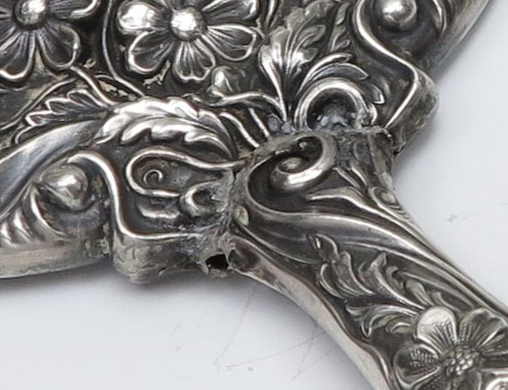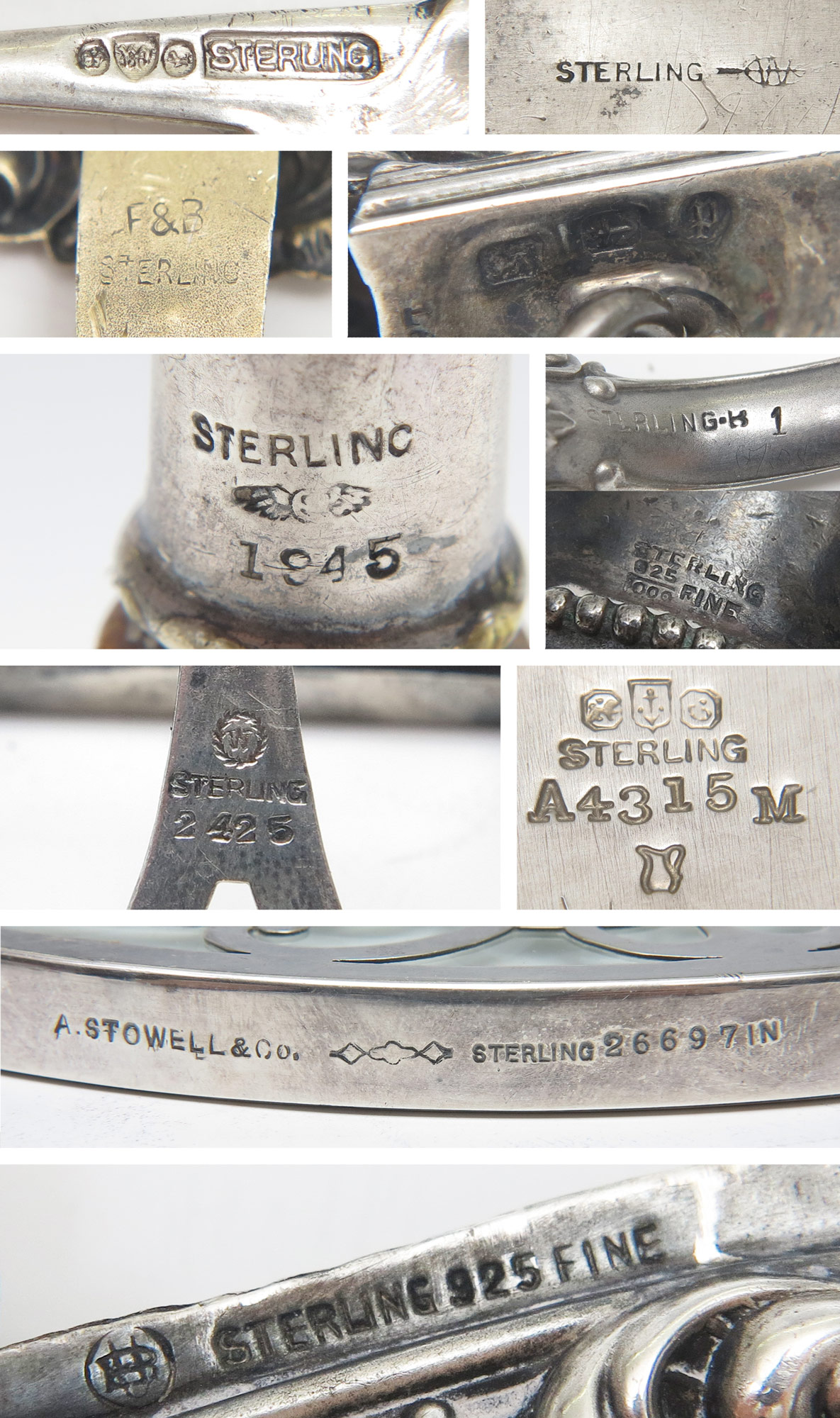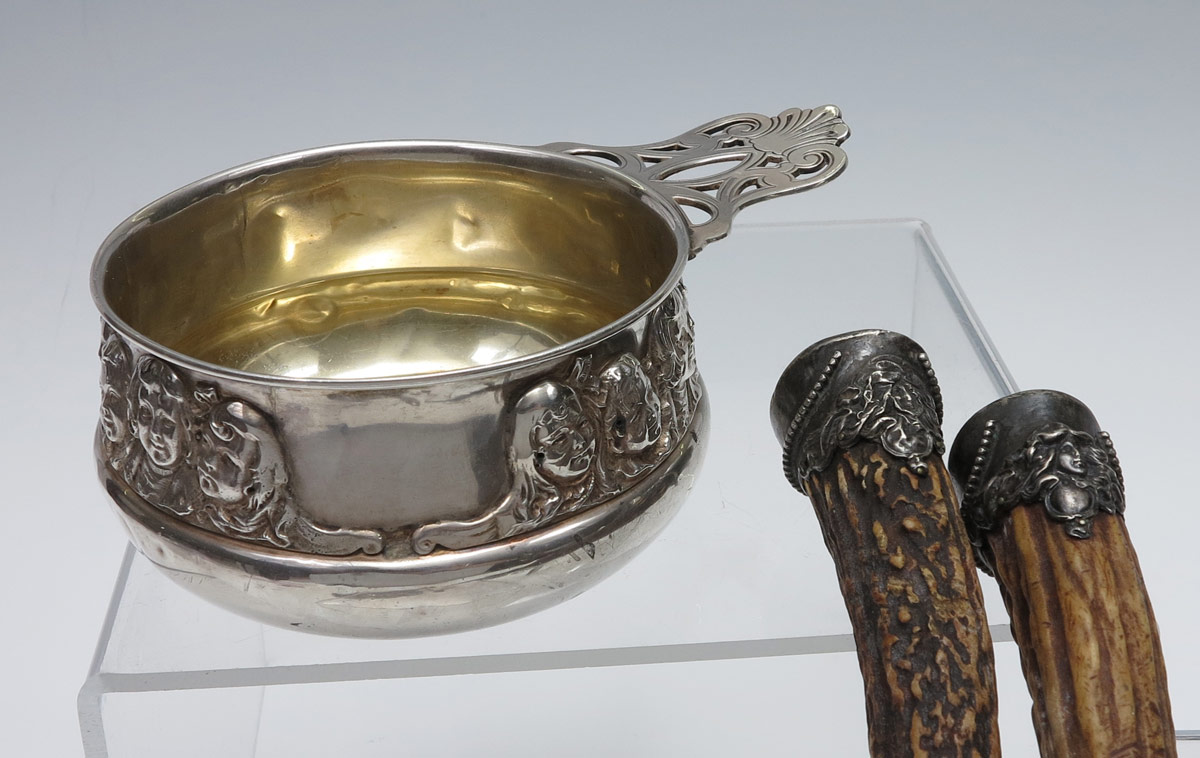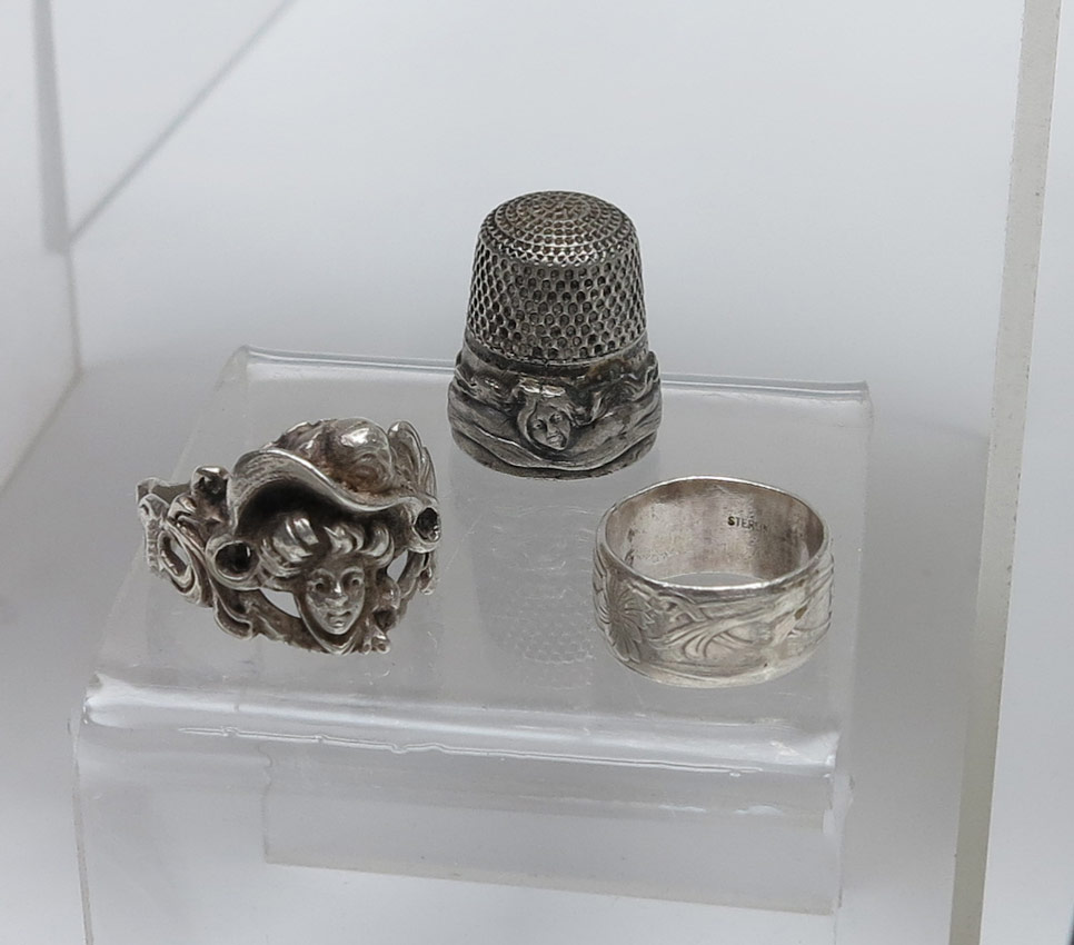 ESTATE COLLECTION OF ART NOUVEAU STERLING ITEMS: An assembled collection of 18 items to include 1) Unger Brothers foliate scroll match safe. 2) 3 Watson corn holders. 3) Gorham porringer with applied vignettes of children, pierced handle. Marked with Gorham mark, Sterling, A4315M, 1903 date mark. 2 3/8'' h. x 7 1/8''. Note pinholes. 4) Shiebler parasol handle, floral repousse rim pommel with left twist design to body. Partial shaft remains. Marked Sterling, Shiebler, 1945. 5 3/8'' l. 5) 2 small bookmarks, larger Webster. 6) Small Woodside calendar frame. 7) 2 rings one size 7 1/2, the other size 3. 8) 2 unknown objets de vertu. 9) Sterling mirror with woman looking at mirror, broken handle. 10) Sterling mounted horn handle carving set, sharpener 15'' l. 11) Graff, Washbourne & Dunn silver mounted over glass trivet, marked A. Stowell & Co., monogrammed 7 1/4'' dia. 12) G. W. Parks swimming woman thimble, applied decoration of a woman swimming around rim, size 6. Marked with G. W. Parks anchor and Sterling. 3/4'' h. Approx. 12.4 troy oz.