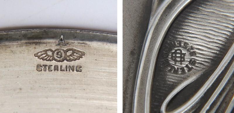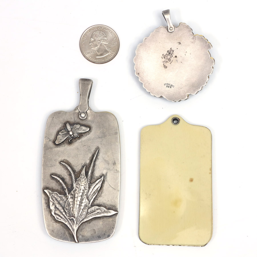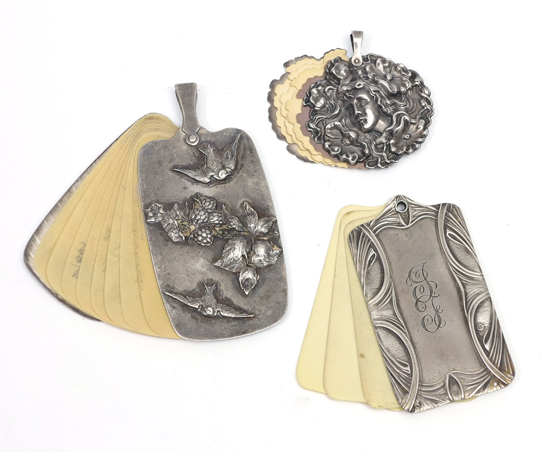 3 ART NOUVEAU STERLING NOTE PADS / DANCE CARDS: 3 pieces total to include 1) Shiebler with applied birds, butterfly and flowers, 7 celluloid writing pages, 5 have writing on them. 3 1/4'' x 1 7/8''. 2) Unger Brothers art nouveau lines front only, 3 celluloid pages, 1 with scribbles, monogrammed. 3) Sterling woman in profile among flowers, 3 celluloid pages with writing.