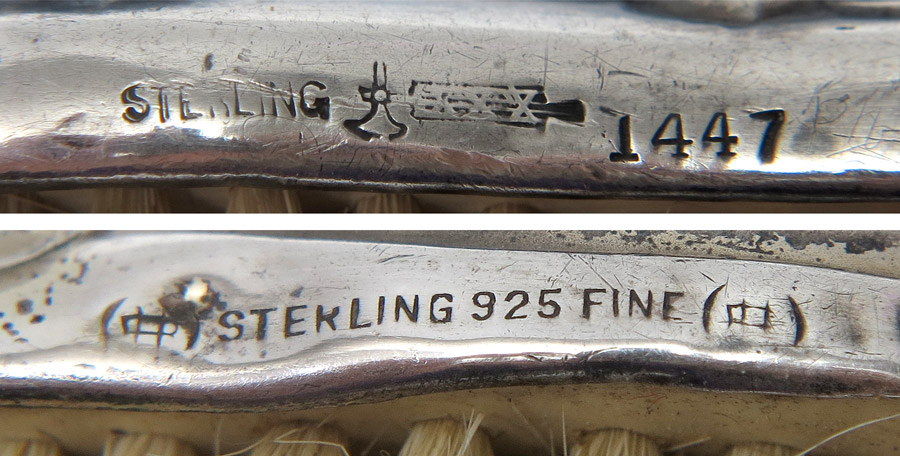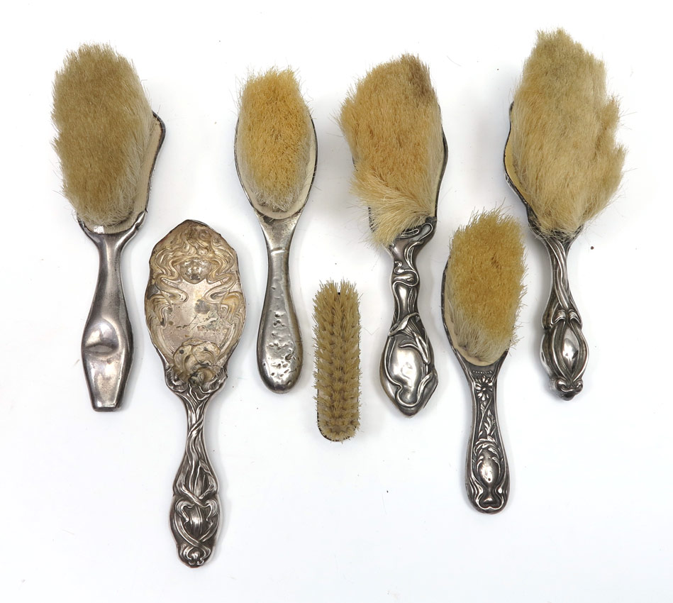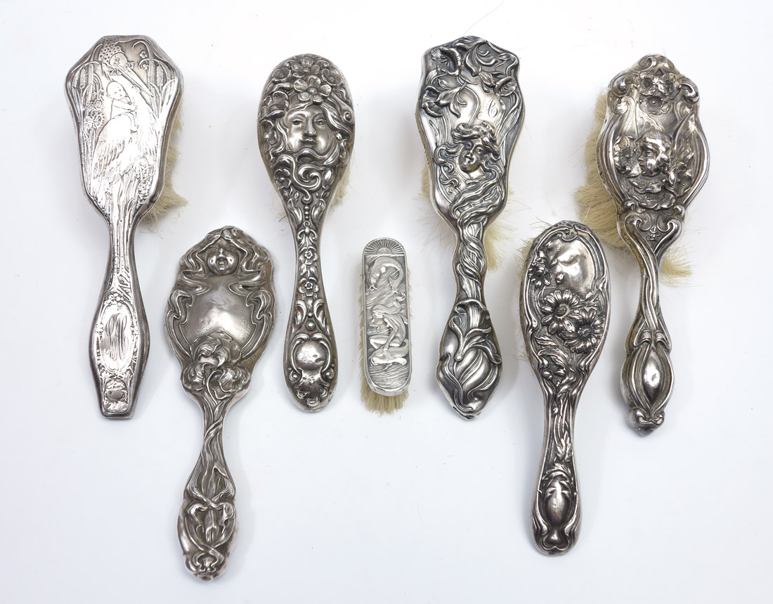 7 FIGURAL ART NOUVEAU STERLING BABY BRUSHES: 7 pieces total to include 1) Kerr baby on stork, monogrammed. 2) Unger Brothers winged child. 3) Unger Brothers child's face, missing bristles. 4) Kerr woman with floral motif, monogrammed. 5) Sterling with woman's face among flowers. 6) Sterling with floral motif. 7) Sterling nail brush with figural nude and koi fish.