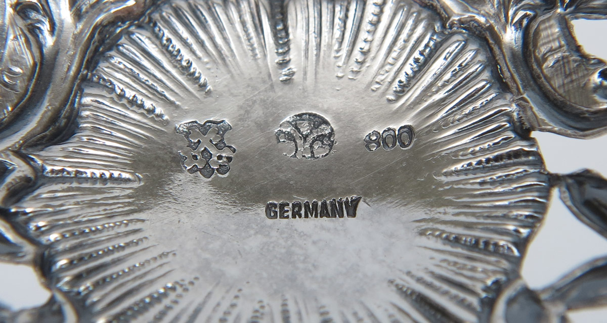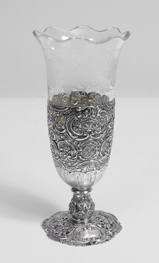 B. NERESHEIMER GERMAN SILVER MOUNTED VASE: Reticulated silver base by Hanau silversmith B. Neresheimer, engraved glass insert with grape and vine motif. Overall 7 1/2'' h. x 3 5/8''. Approx. 3.0 troy oz .800 silver.