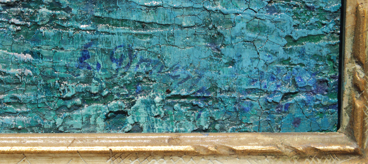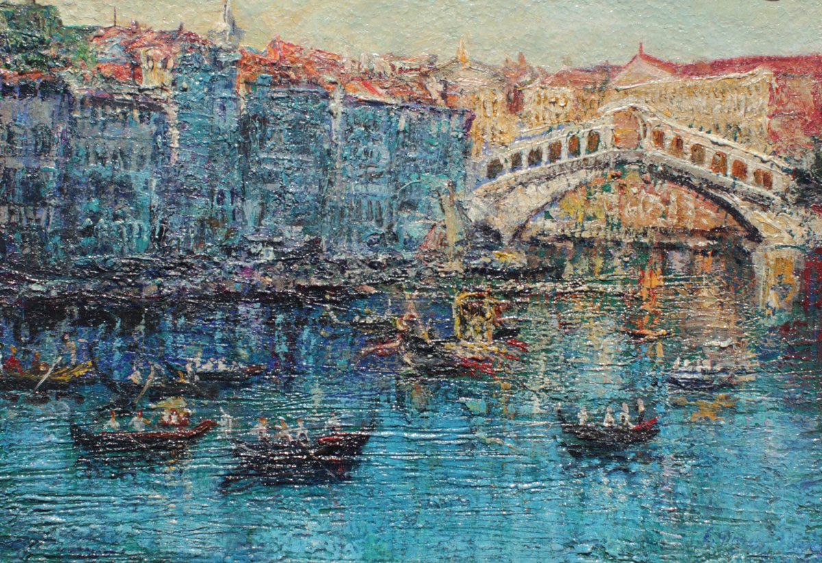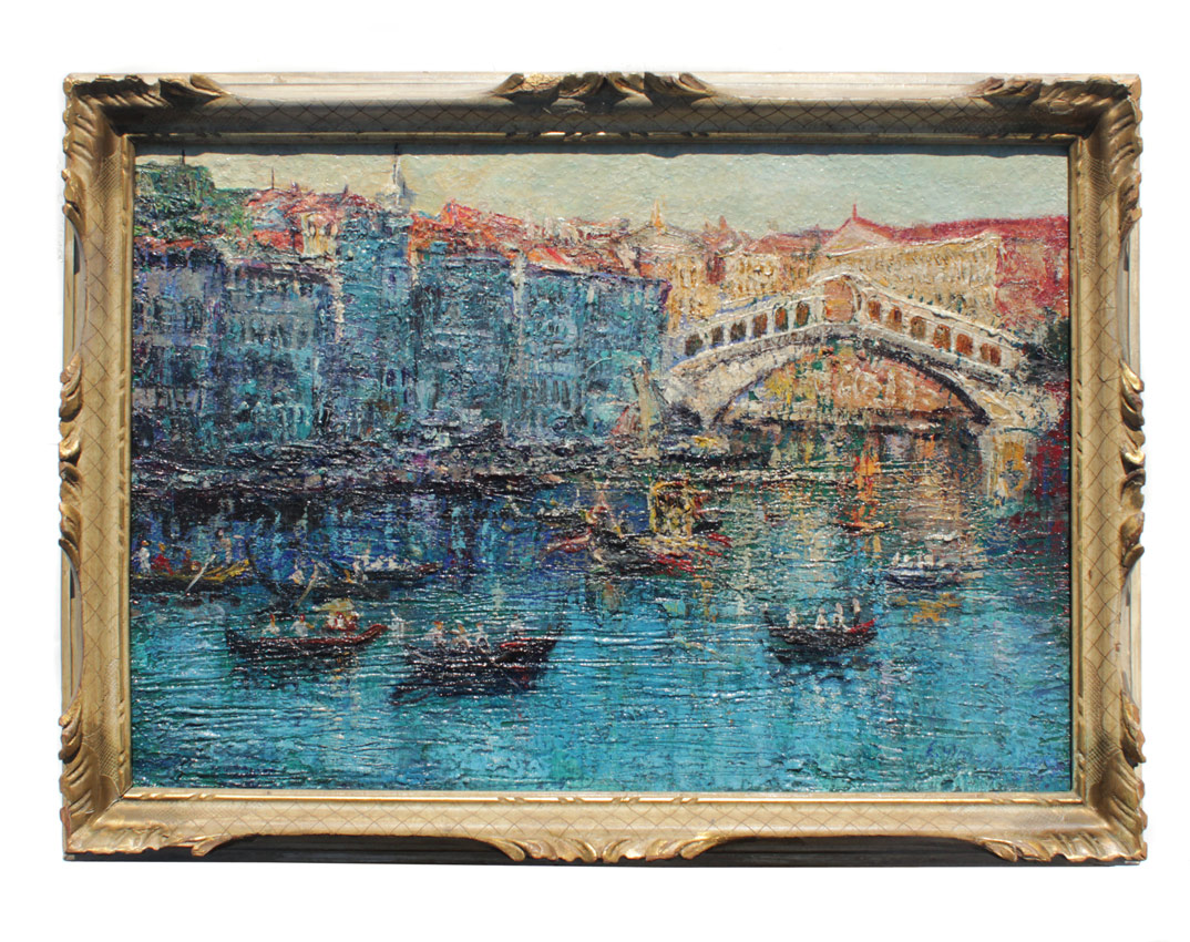 GOOD ILLEGIBLY SIGNED VENETIAN CANAL PAINTING: Oil/Canvas Laid down on Masonite, 15'' x 21 1/2'', illegibly signed lower right, encased in carved and gilded period frame with wear and repair 18 1/4'' x 24 1/2''.