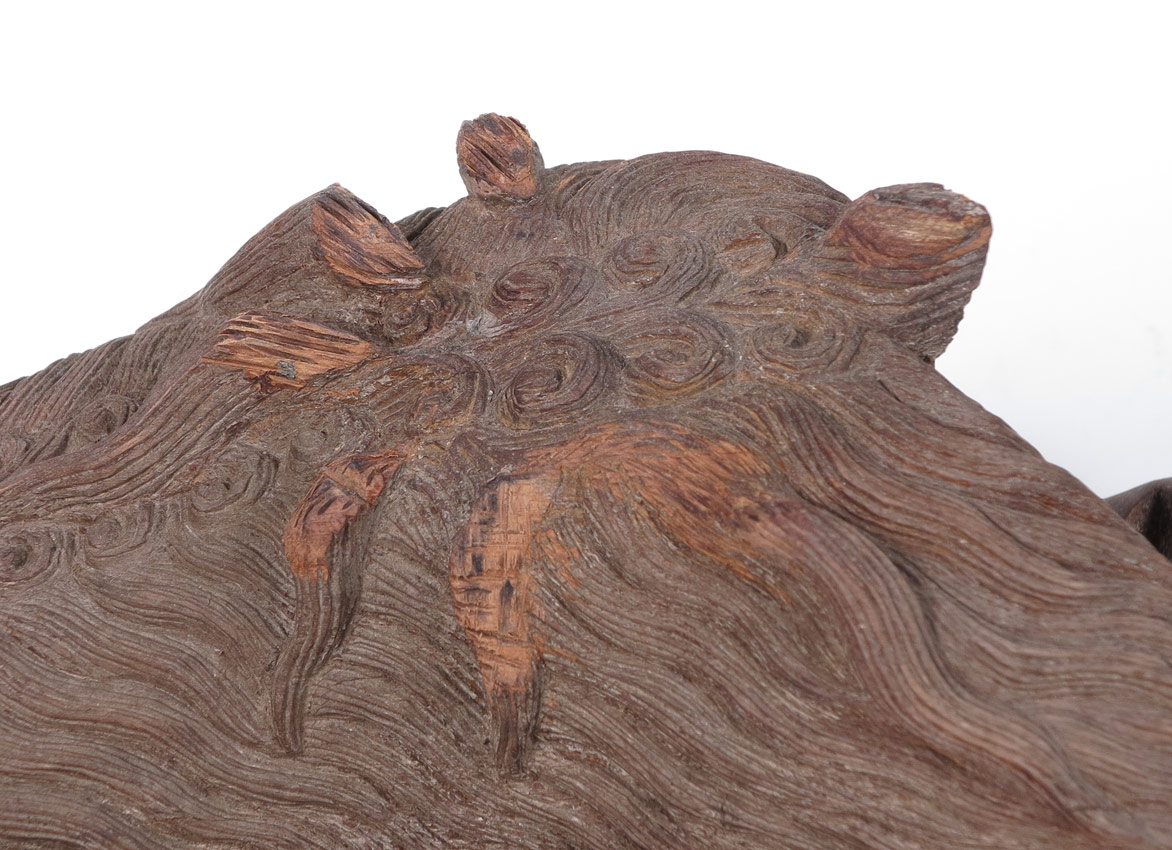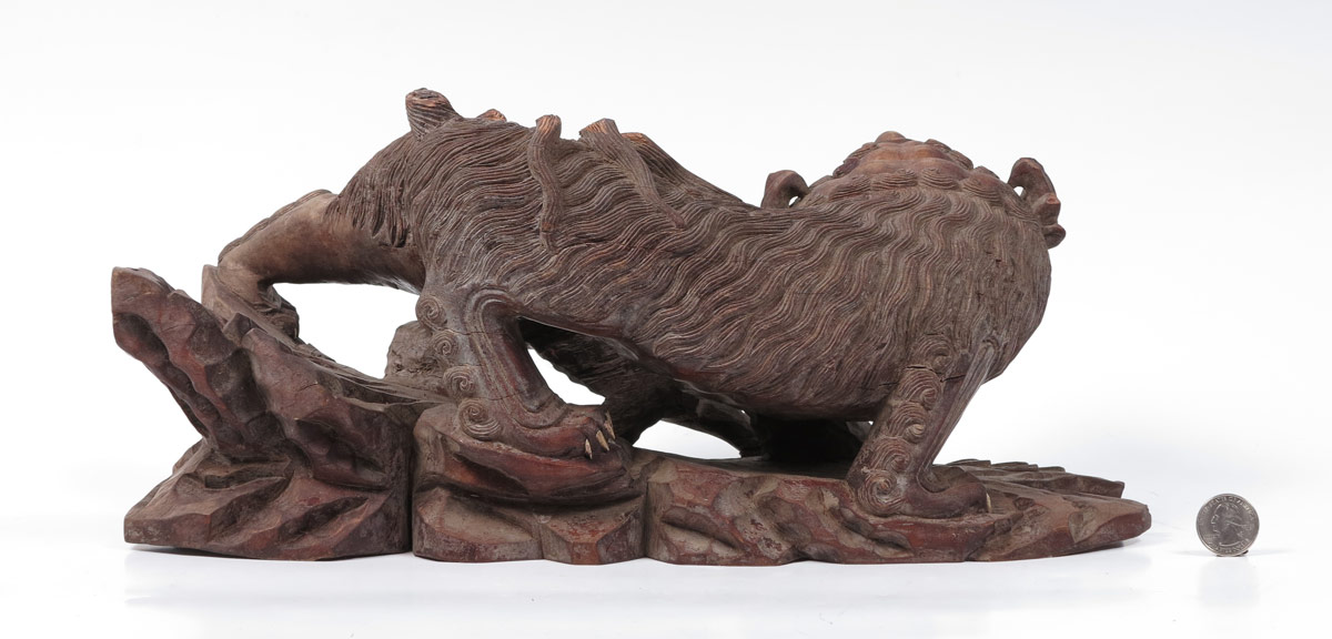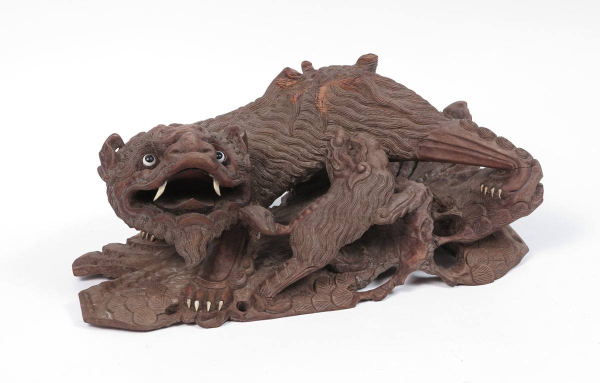 ASIAN CARVED WOOD FOO LION & CUB: Detailed carved wood foo lion and cub, lion with glass eyes, ivory tusks and claws. 7 1/2'' h. x 16 1/2'' x 7''.