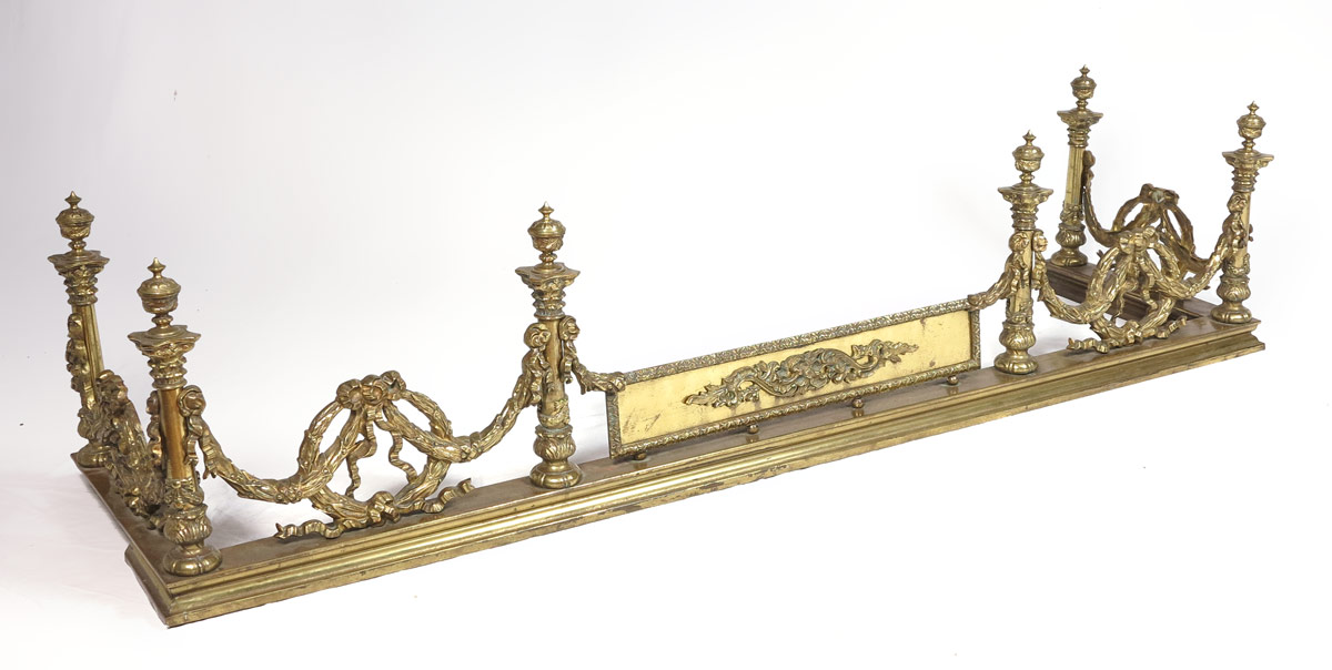 ORNATE BRASS FIREPLACE FENDER: With garland swags and applied decoration. 12 3/4'' h. x 54'' x 14''.