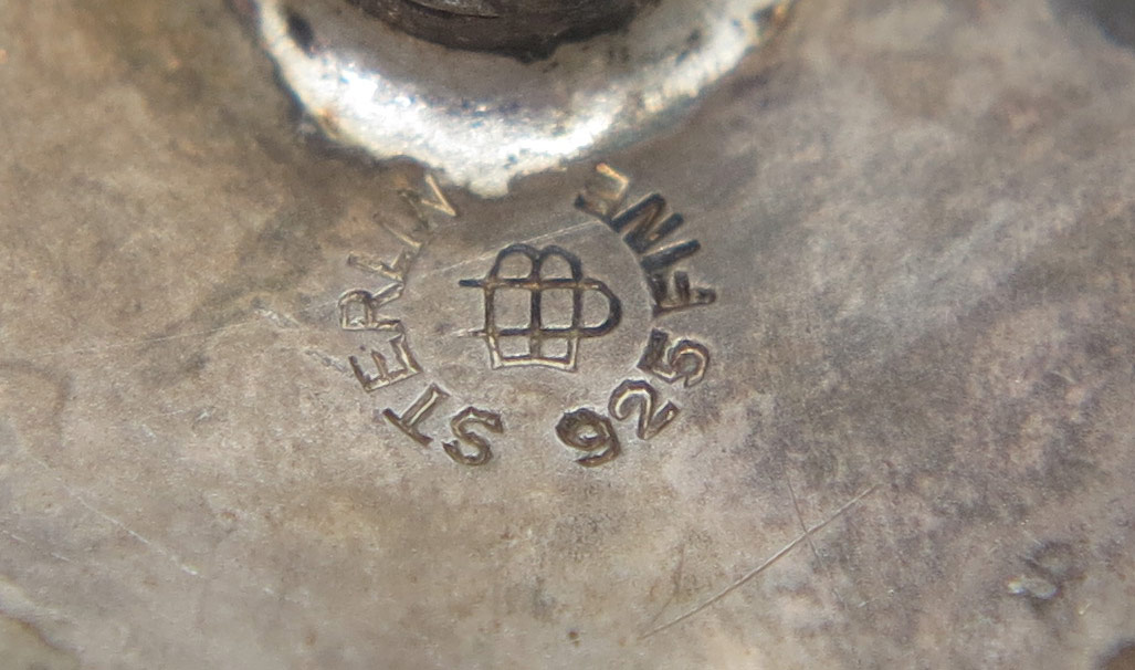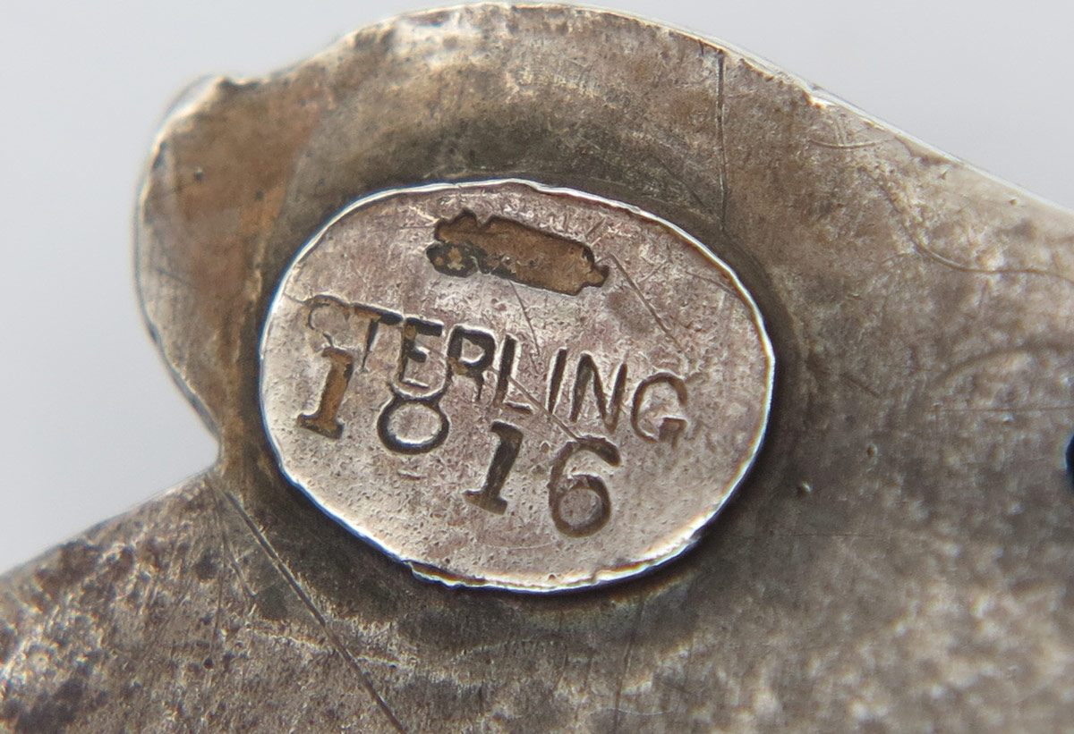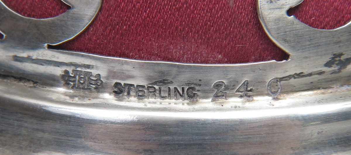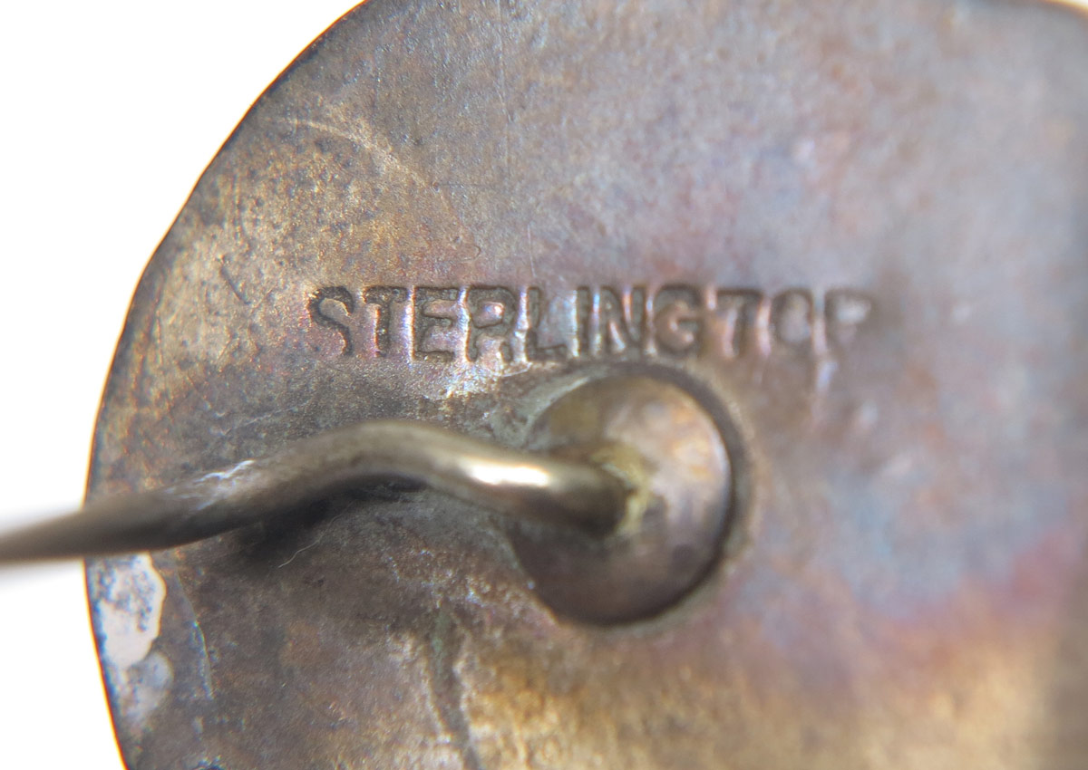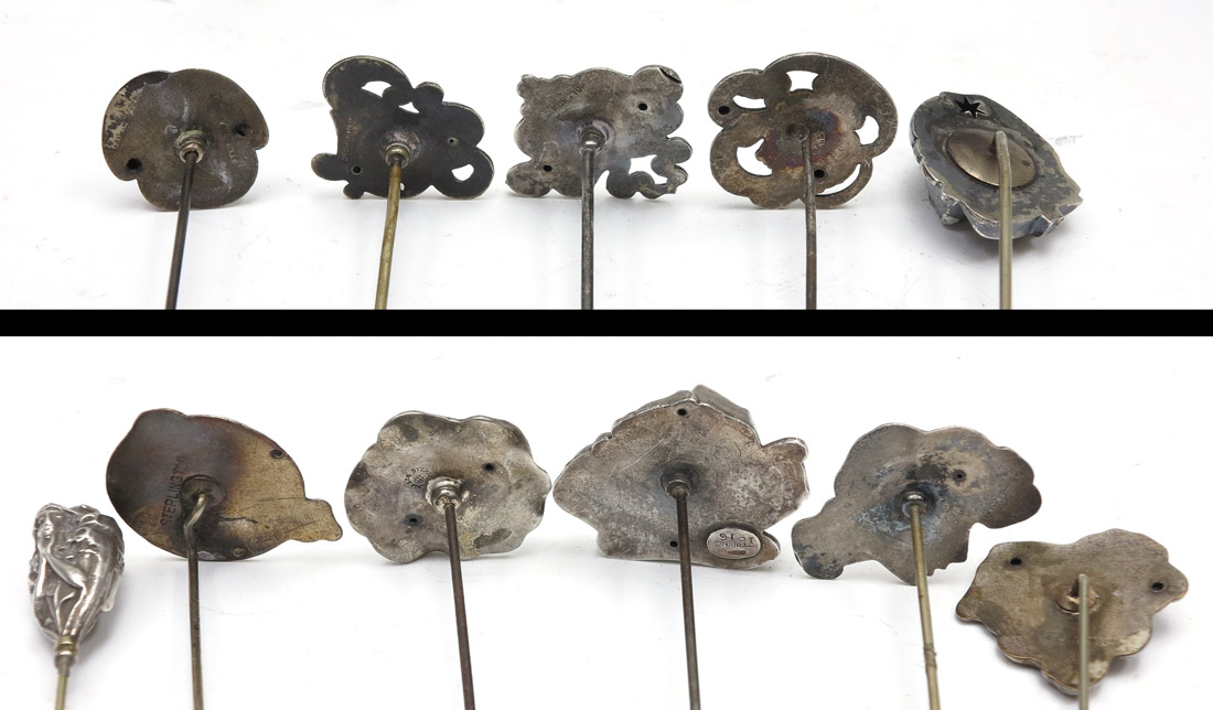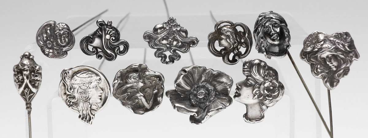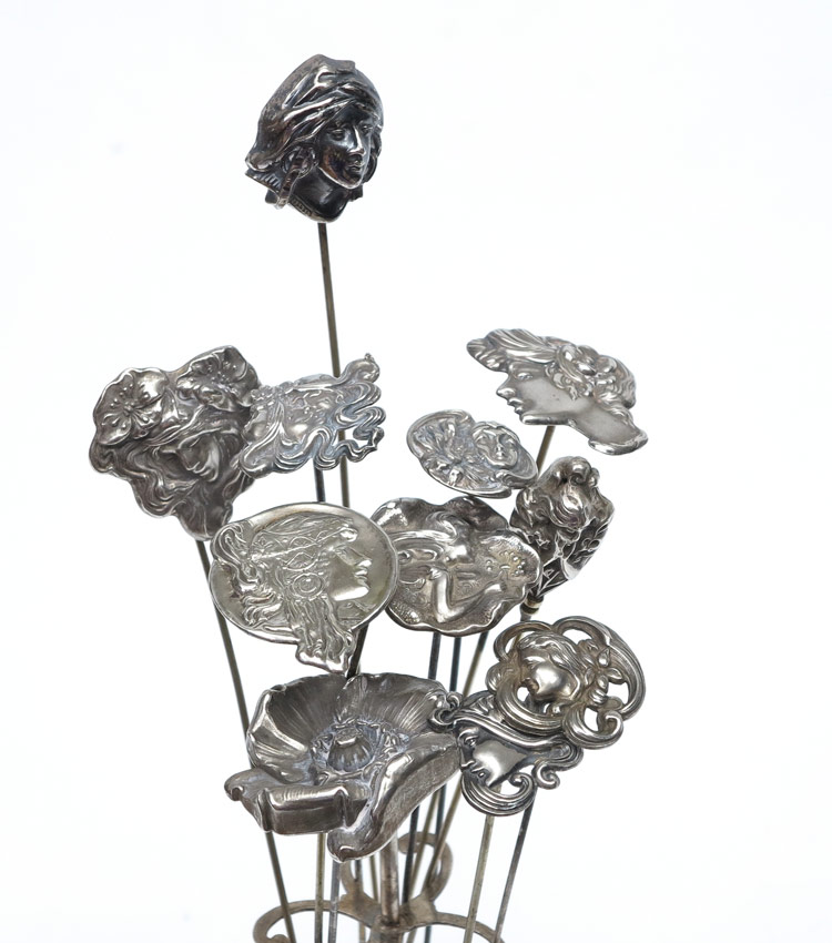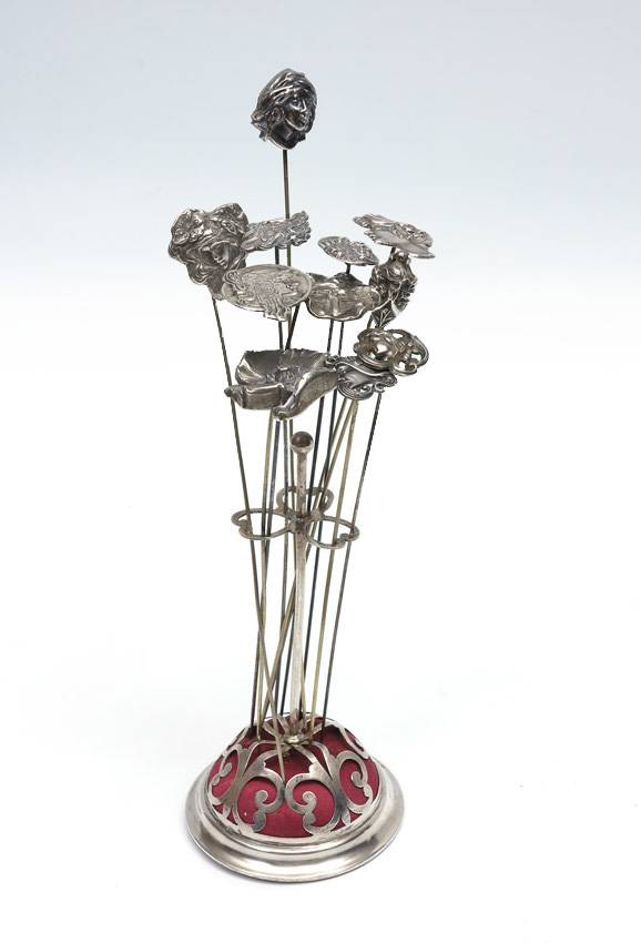 12 PIECE ART NOUVEAU STERLING HATPINS & HOLDER: 12 pieces total to include 1) George A. Henckel & Co hatpin holder, 6 1/2'' h. x 3 3/8''. 2) 11 different period hatpins, each marked sterling, sterling front, or sterling top; the large flower by Kerr, one woman by Unger Bros., and the others by unknown makers.