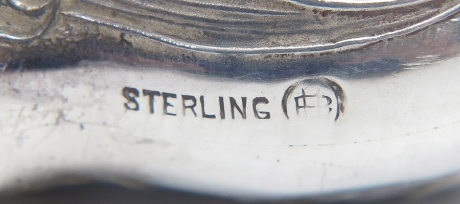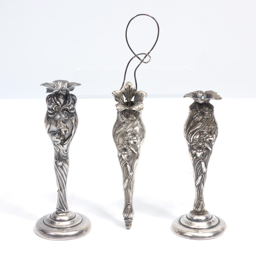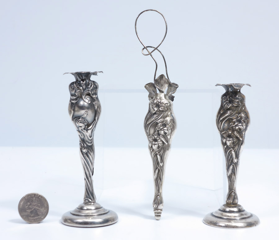 3 ART NOUVEAU STERLING HAT PIN HOLDERS: 3 pieces total to include 1) Unger Brothers ''Les Secrete des Fleurs'' pattern with applied Alpha Tau Omega Greek letters. Weighted base, note twist and seam splits, no marks. 4 5/8'' h. 2) Unger Brothers floral motif. 3) Unger Brothers floral motif hanging holder, 6 3/4''.