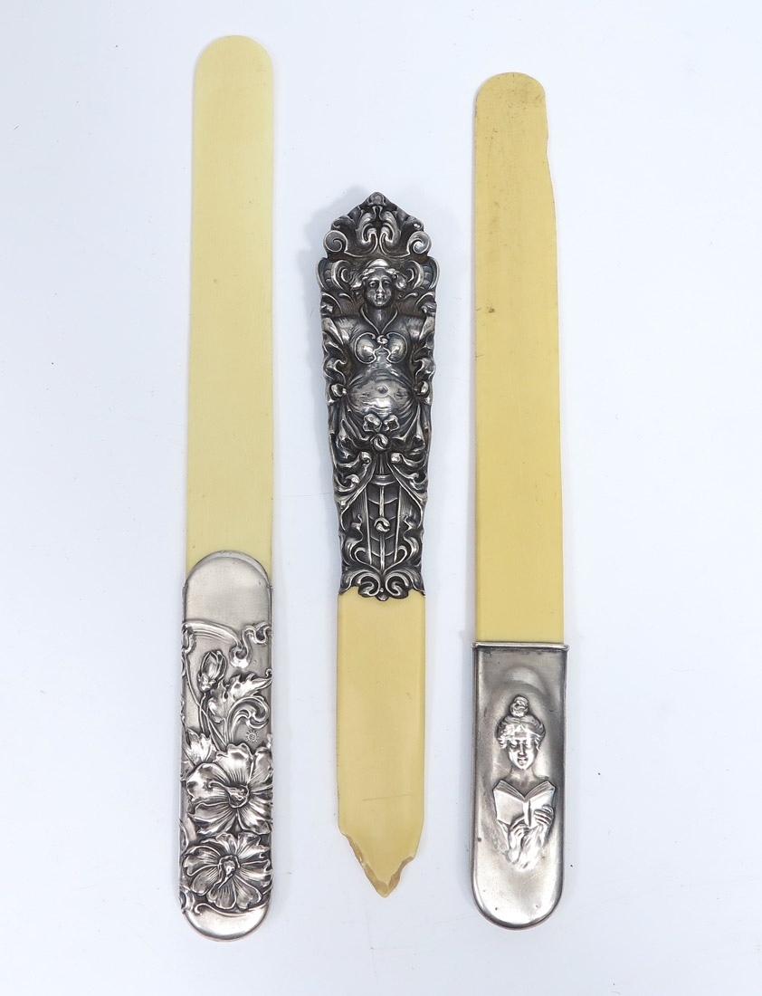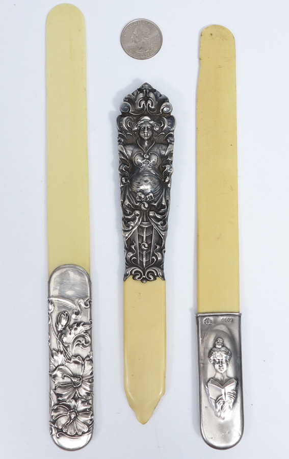 3 ART NOUVEAU STERLING PAGE TURNERS: 3 pieces total each with ivory or faux ivory blades to include 1) Unger Brothers woman reading book, stamped 0609, overall 9 3/8'' long, note chip to blade. 2) Unger Brothers floral motif, 9 7/8'' long. 3) Sterling full body woman, 7 3/8'' long, missing half of blade.