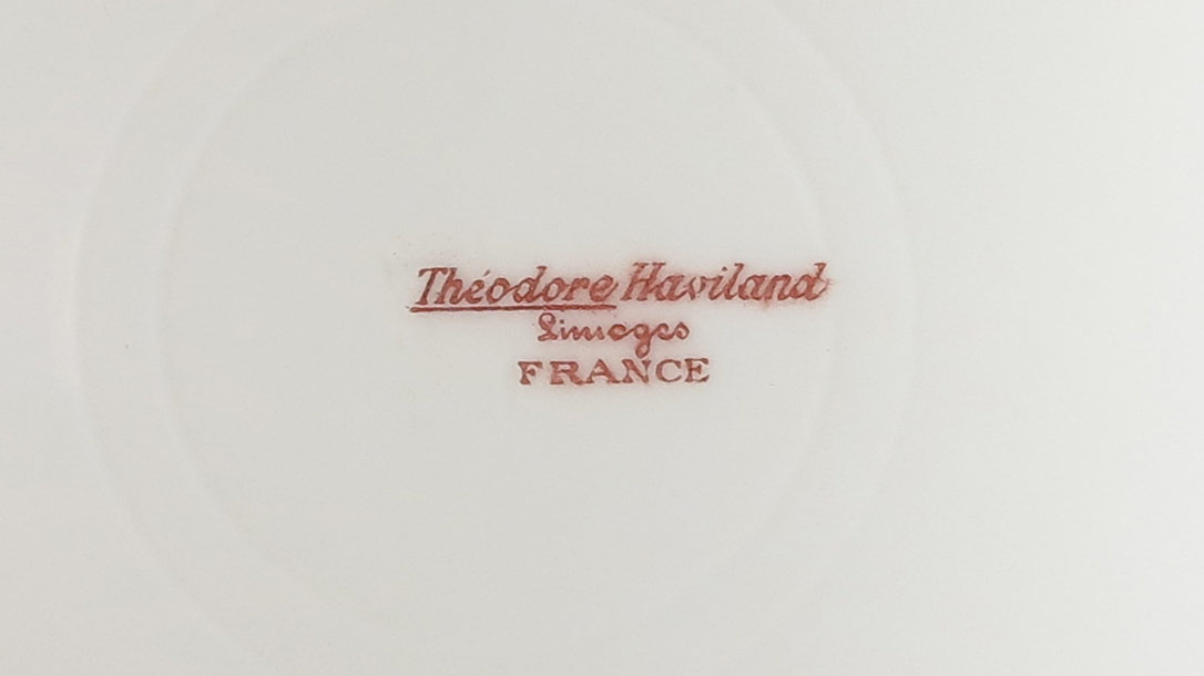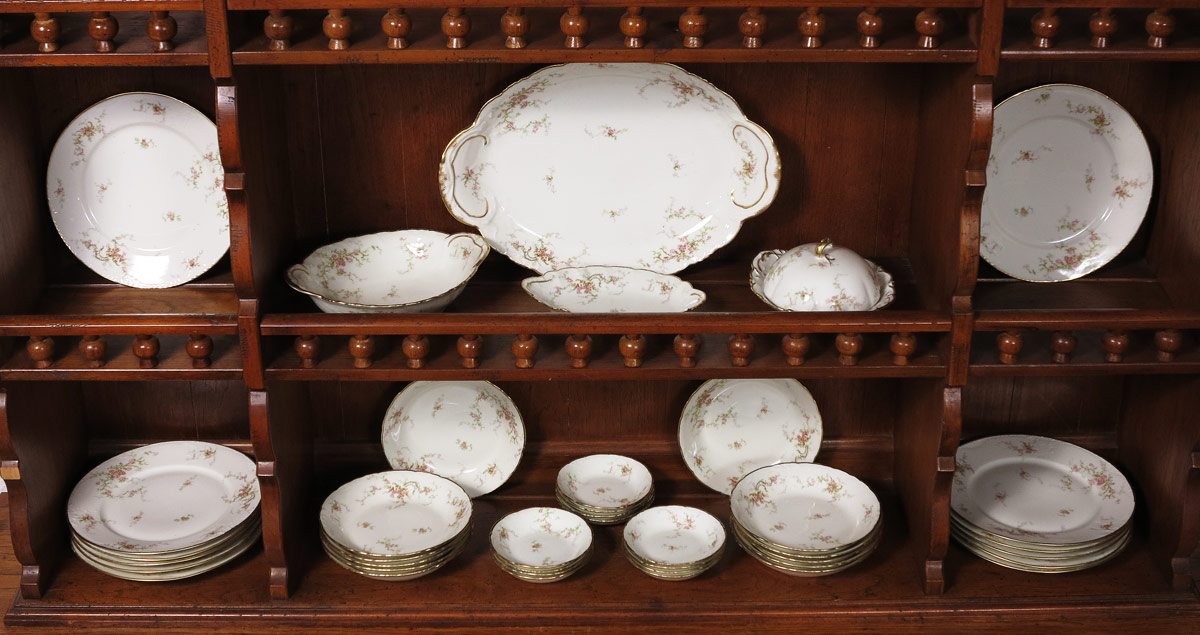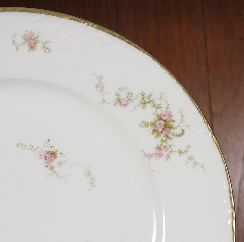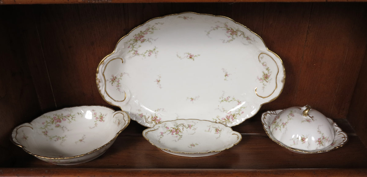 THEODORE HAVILAND CHINA SET ROSE PATTERN: Approx. 40 pieces by Theodore Haviland with rose and gilt decoration to include 12 plates (9 7/8''), 12 bowls (7 1/2''), 12 dessert bowls (5''), platter (16 1/2'' x 11 1/4''), open vegetable (10'' x 7 3/4''), serving dish, covered butter with insert.