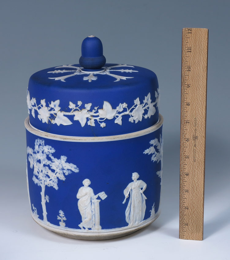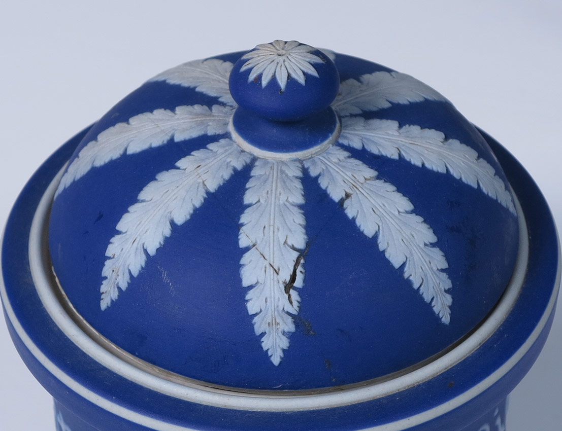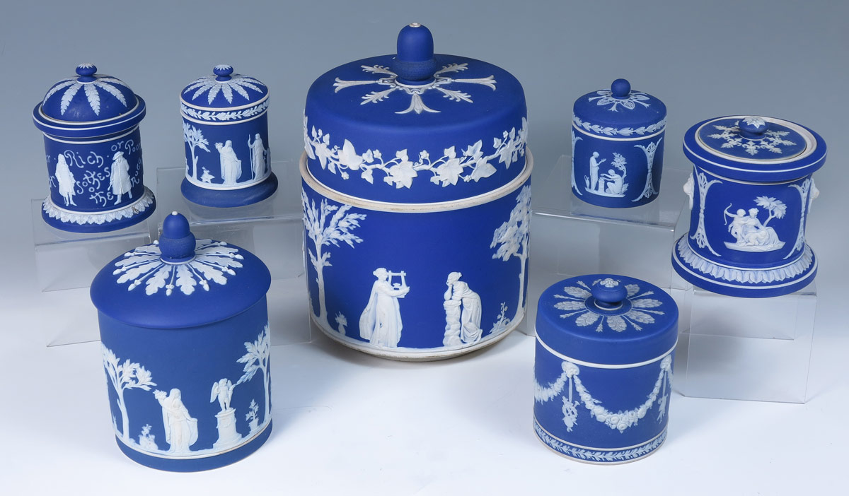 7 DARK BLUE WEDGWOOD JASPERWARE COVERED JARS: Classic dark blue covered jars. The largest, 11'' tall x 7'', with pierced holes in the lid. Smallest measures 4 1/2''h. x 3''. Made in England.