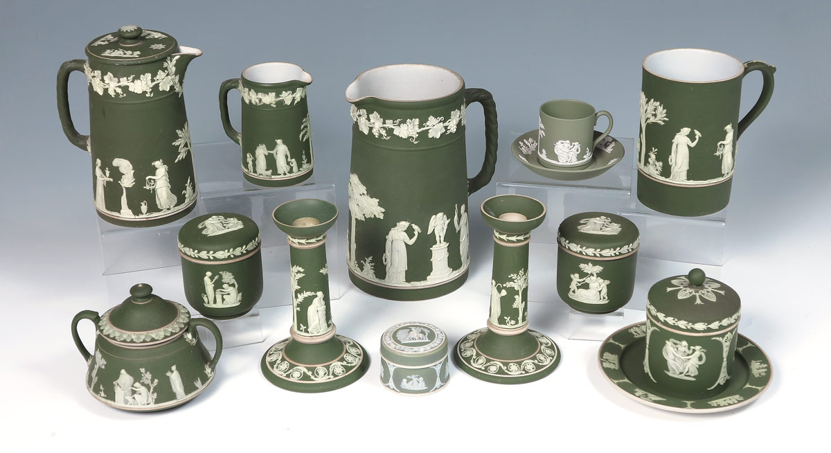 13 PIECE DARK GREEN WEDGWOOD JASPERWARE: To include pair 6'' candles, 8'' jug, 5 1/2'' handled mug, covered sugar, small pitcher. The tallest is the 8'' jug, the smallest is the 2'' covered jar.
