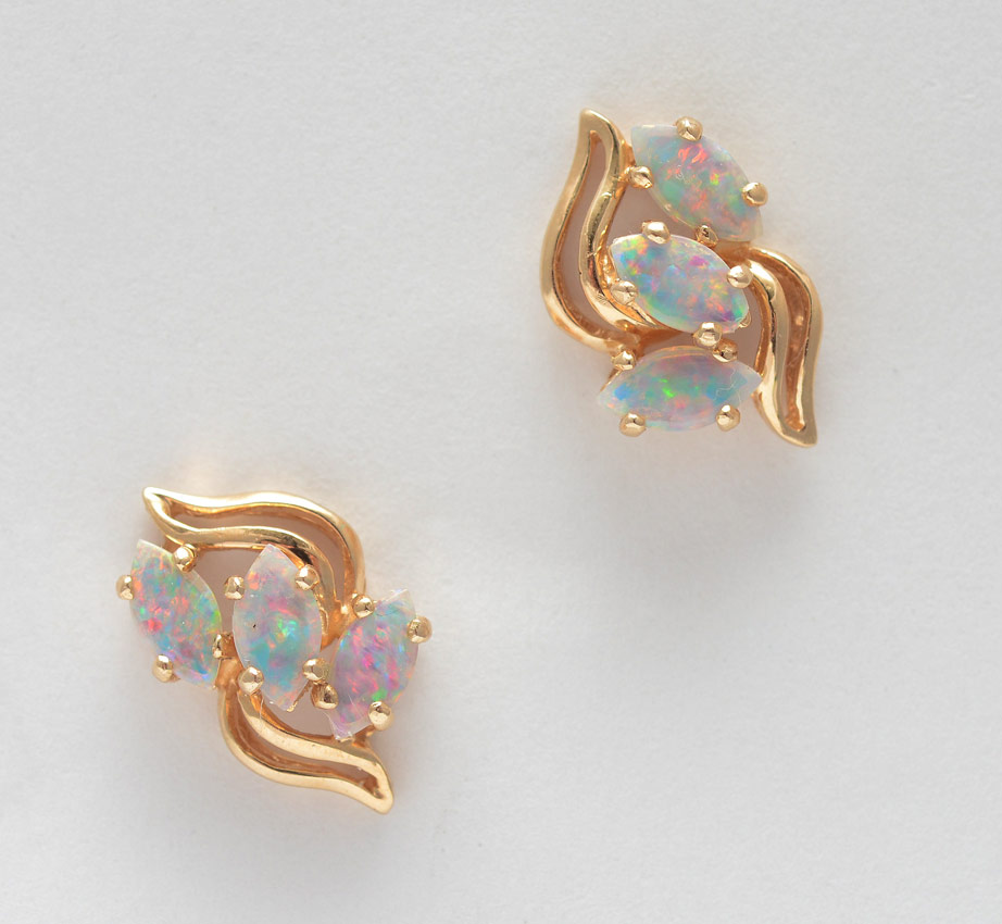 14K OPAL EARRINGS: 14k yellow gold post earrings each set with three small marquise cut opals, 2.3 grams.