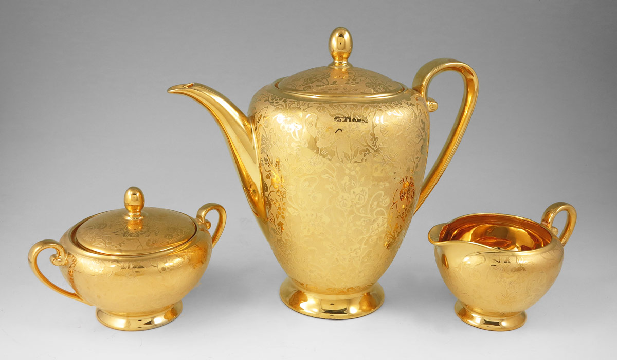 TIRSCHENREUTH BAVARIAN GILT PORCELAIN COFFEE SET: 3 piece set with all over gilt floral design. The pot measures 9'' tall.