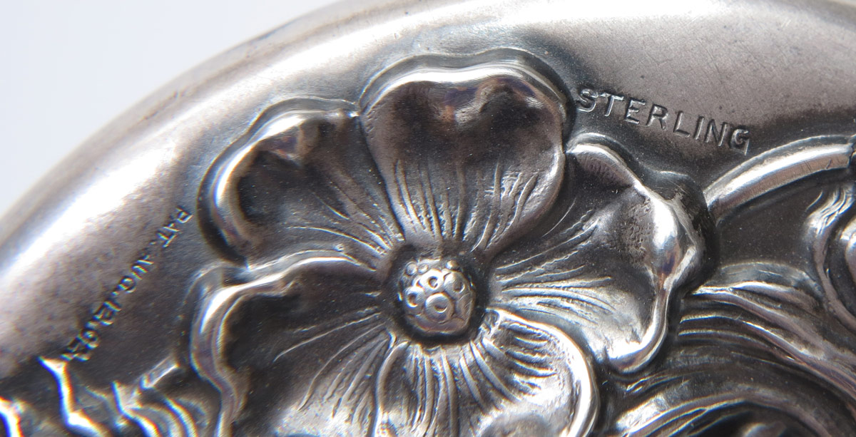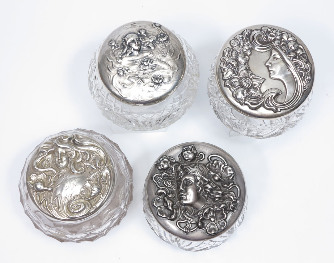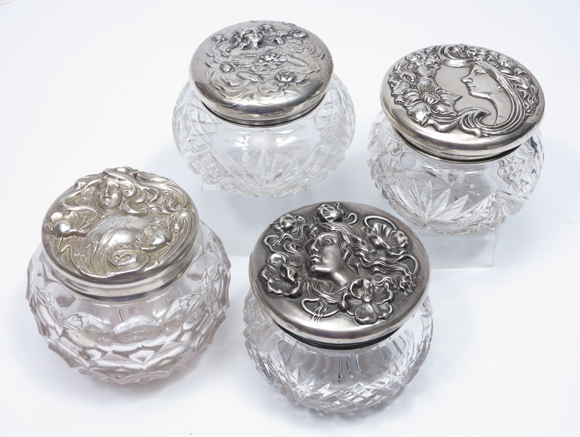 4 ART NOUVEAU STERLING LIDDED DRESSER JARS: 4 pieces total to include 1) Unger Brothers woman in water with water lilies. 2) 3 others marked sterling with woman and flowers motifs. One monogrammed. Largest 3 3/4'' h. x 4'' dia.