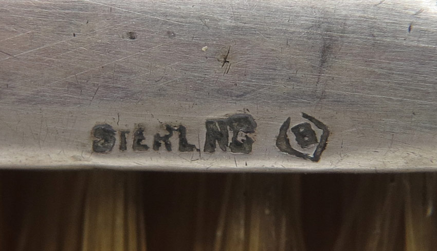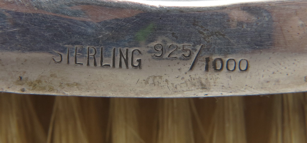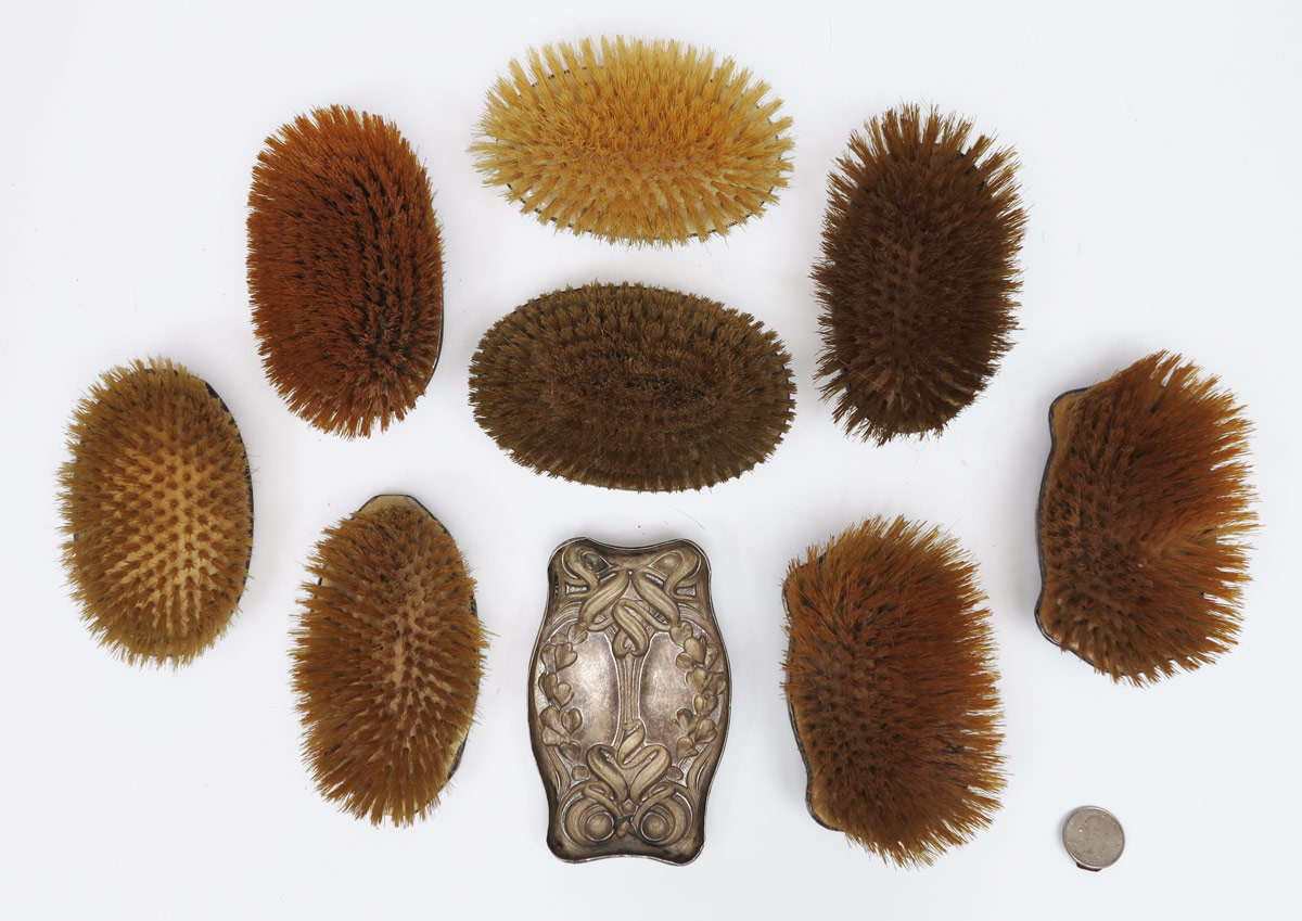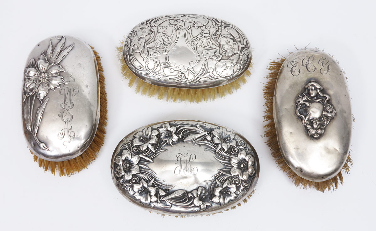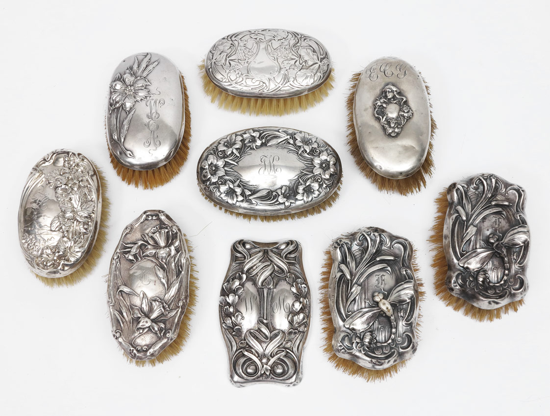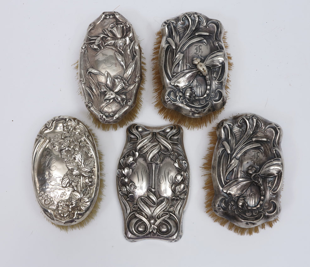 9 STERLING ART NOUVEAU MILITARY BRUSHES: 8 pieces total to include 1) Unger Brothers floral motif. 2) Kerr floral motif, missing bristles. 3) Pair sterling with dragonfly motifs. 4) 5 others with unknown makers or no makers mark. 4 1/2'' x 1 3/4''. All pieces monogrammed.