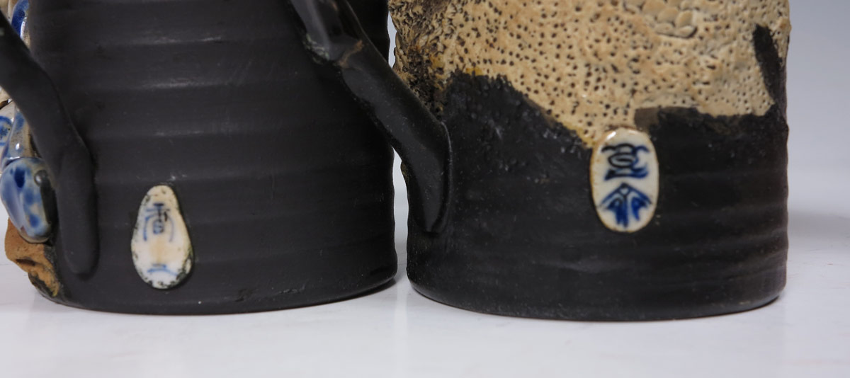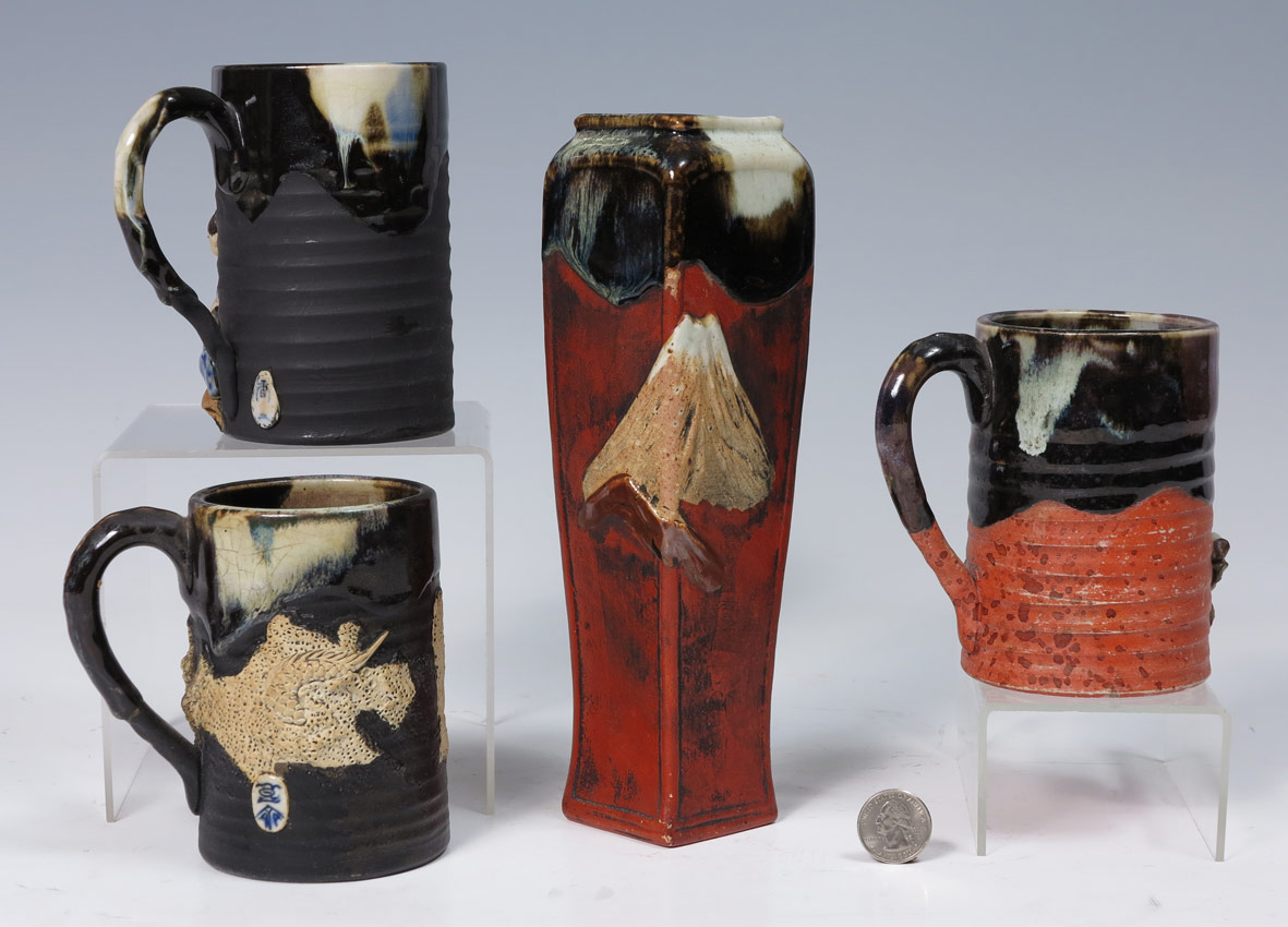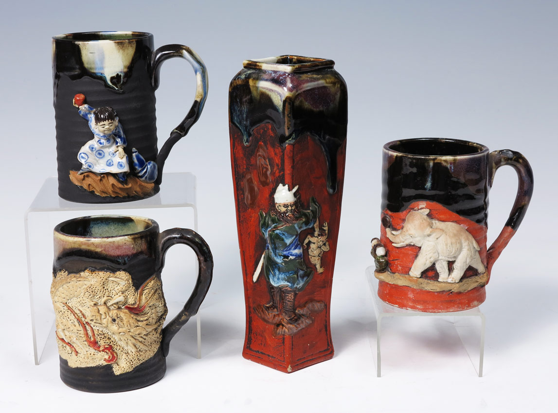 4 PIECE PIECE GROUP JAPANESE BANKO POTTERY: Also known as Sumida Gawa. A 9 1/2'' vase and 3 mugs , 4 1/2''.