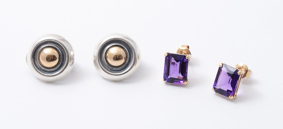 TWO PAIRS STERLING & GOLD EARRINGS: 1) Sterling silver and 14K yellow gold button earrings, bears the hallmark of James Avery. 2) 14K earrings contain two emerald cut amethyst, approx. 7.00 Ct. The amethyst are prong set. Gold Weight: 1.8 grams approx. Sterling weight: 6.00 grams approx. High: 250. Low: 225. Start: 200. Scrap: 47.