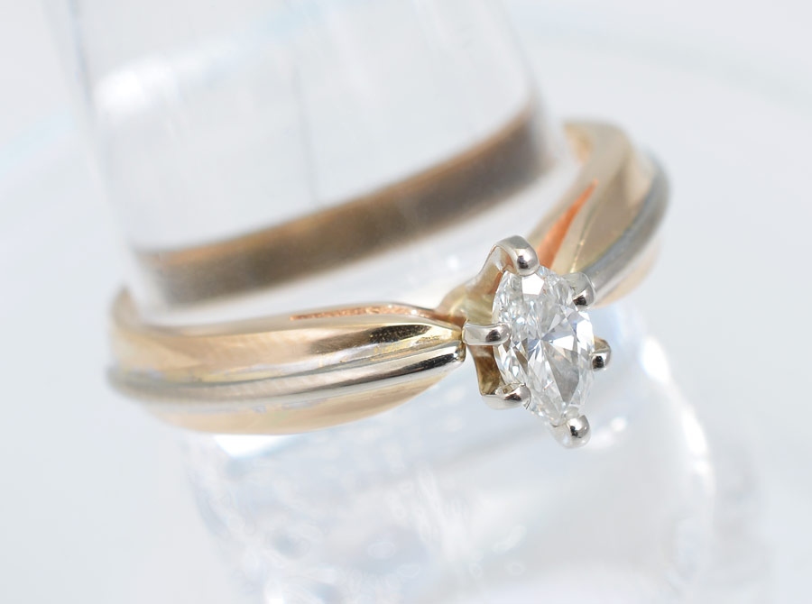 .25 CT. MARQUIS DIAMOND SOLITAIRE RING: 14K yellow gold ring contains one marquise cut diamond. Weight: .25 Ct. Approx. Rated SI1 in clarity and I in color. The diamond is prong set. Weight: 4.8 grams. Size: 8