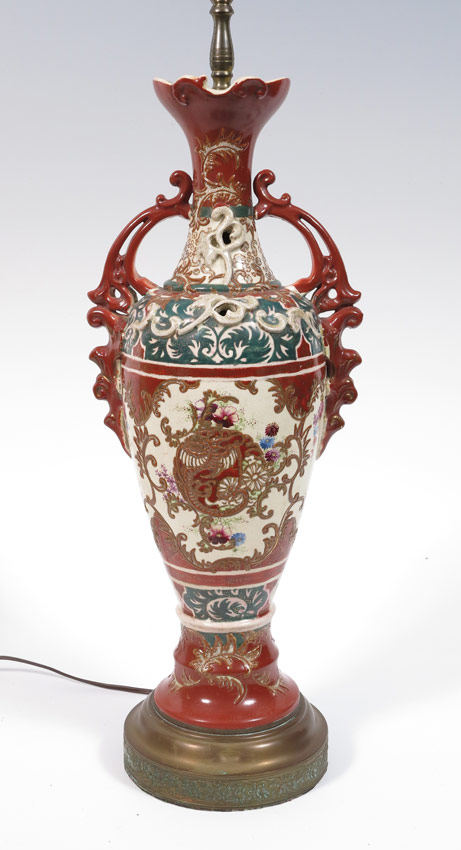 ASIAN SATSUMA EARTHENWARE LAMP: Polychrome pottery measures 22'', the lamp is 38'' tall overall.