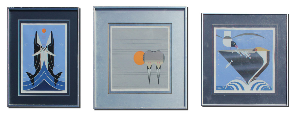THREE PIECE CHARLES HARPER SERIGRAPH LOT: To include; 1) ''Pelican Pantry'', Sight size 15'' x 15'', pencil signed lower right, #'d 1411/1500, metal frame 21 1/4'' x 21 1/4''. 2) ''Lovey Dovey'', Sight size 15'' x 14 3/4'', pencil signed lower right, #'d 2192/2500, worn metal frame 24'' x 23 1/2''. 3) ''Romance on the Richter Scale'', Sight size 17'' x 13 1/4'', pencil signed lower right, #'d 169/1500, metal frame 24 1/4'' x 20 1/2''.