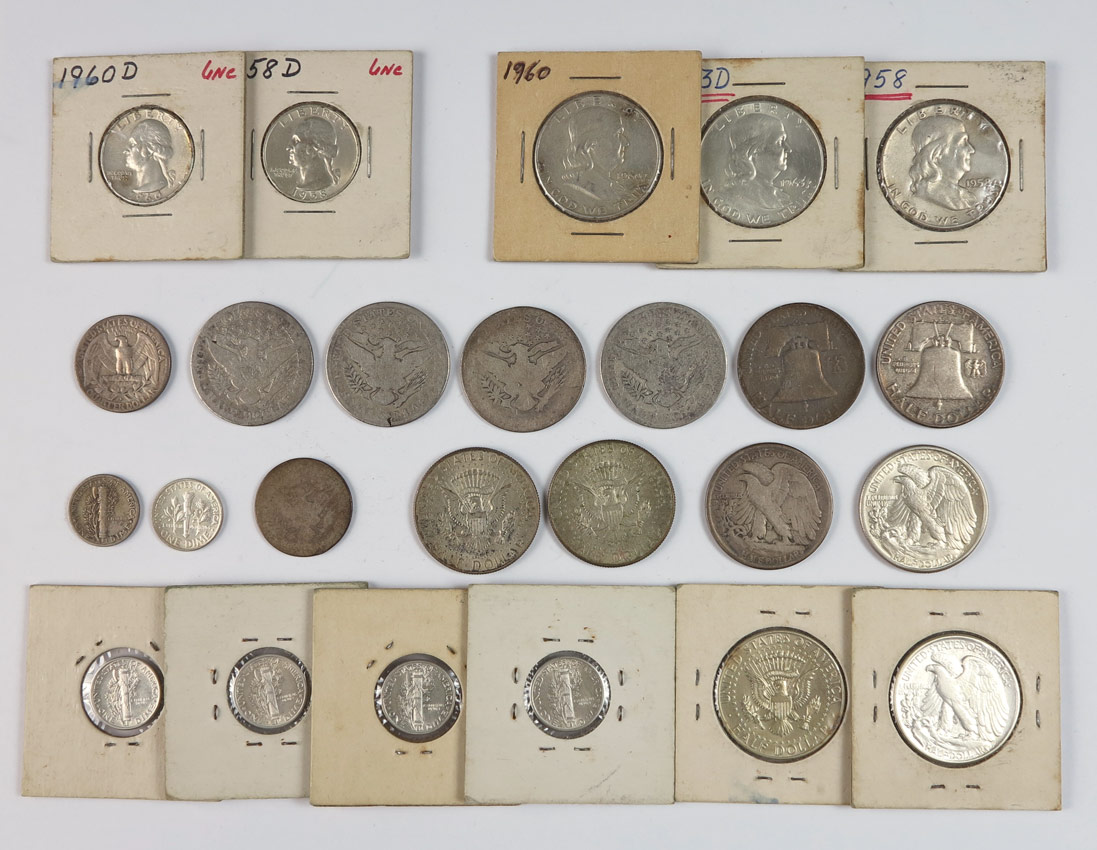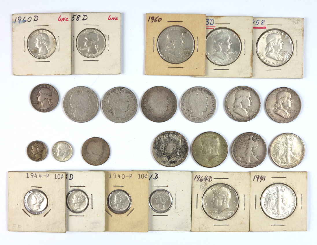 ESTATE COLLECTION OF US SILVER COINS: Approx. 25 coins to include 4 Baber half dollars 1902, 1904, 1906, 1911; 3 Walking Liberty half dollars 1941, 1942, 1944; 5 Franklin half dollars 1951, 1958, 1960, 1962, 1963; 2 1964 Kennedy halfs and one 1967 clad Kennedy half; 1 illegible date Barber quarter, 3 Washington quarters 1953-D, 1958-D, 1960-D; 5 mercury dimes 1940, 1941-D, 1942, 1943-D, 1944; 1 Roosevelt dime 1964. Estate finds, ungraded.