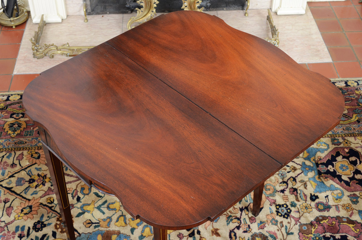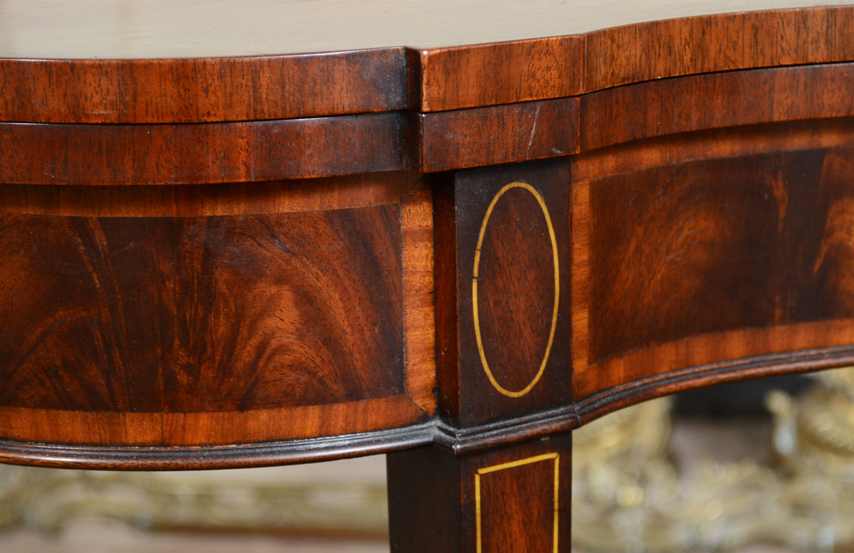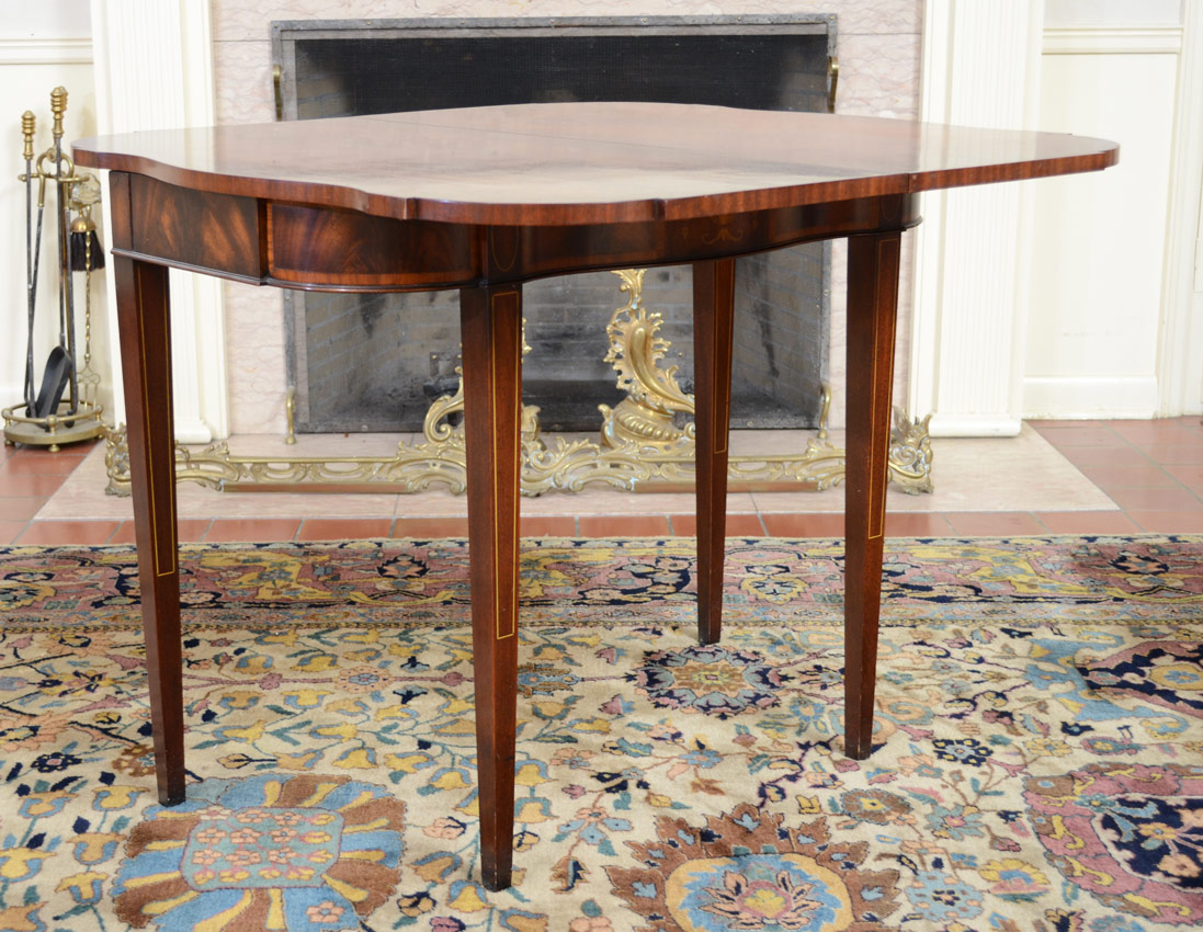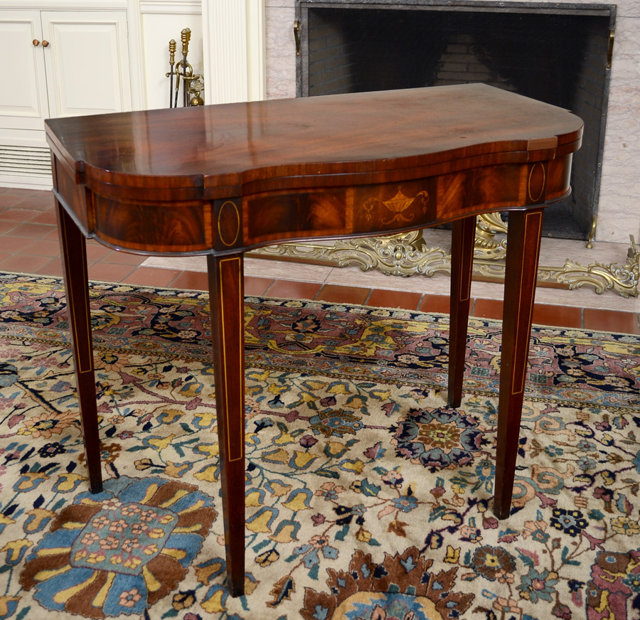 CROTCH MAHOGANY INLAID GAME TABLE: Shaped top lifts and rotates. Urn marquetry and string inlay on front, string inlay on legs. 30'' h. x 36'' x 18 1/2''.