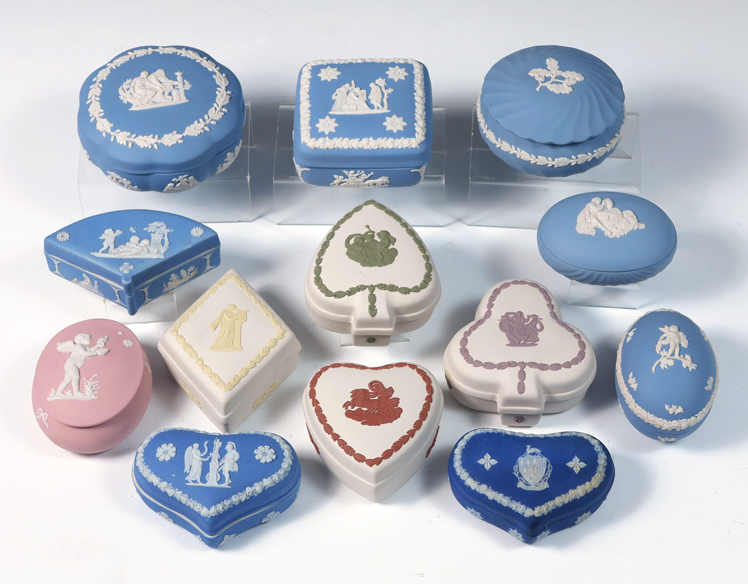 A COLLECTION OF 13 WEDGWOOD COVERED BOXES: To include the 4 suite boxes, egg, fan, round and heart boxes. The largest being 2''h. x 4 1/4''. the smallest 1 1/2'' x 4 1/2''.