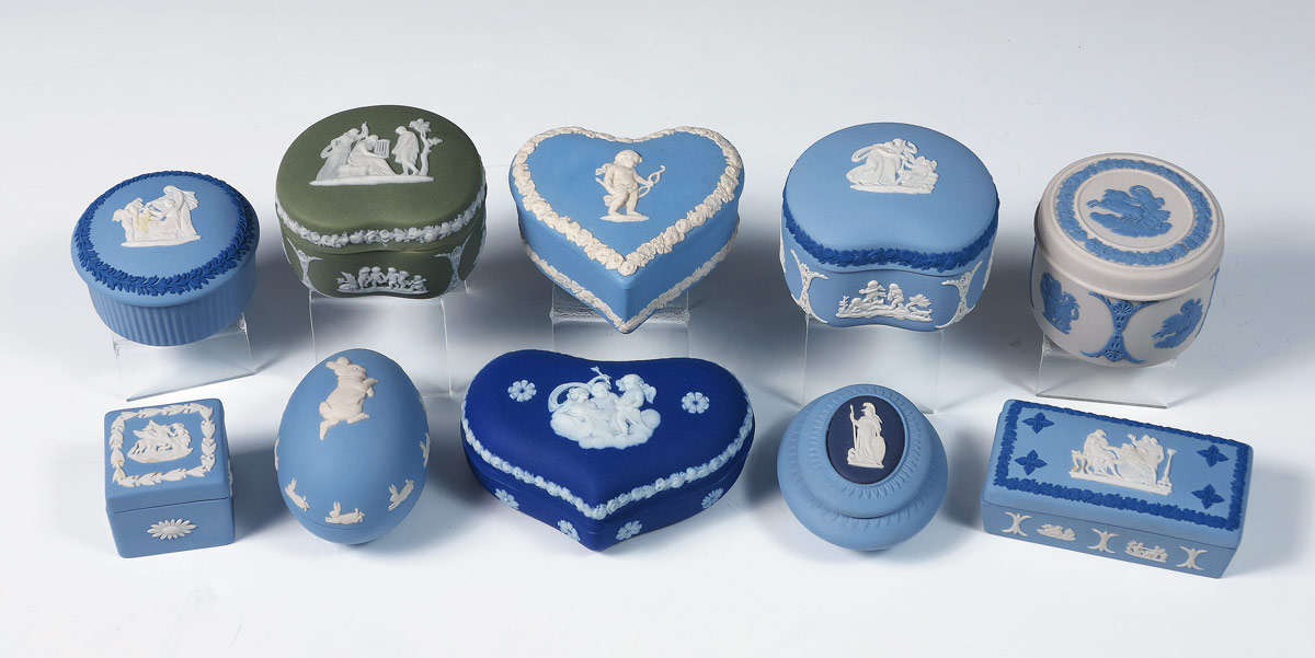 COLLECTION OF 10 WEDGWOOD MINIATURE COVERED BOXES: To include Peter Rabbit egg, hearts and round boxes. The smallest being the 1.5'' square blue and white box, the largest is 1 1/2'' tall x 4''.