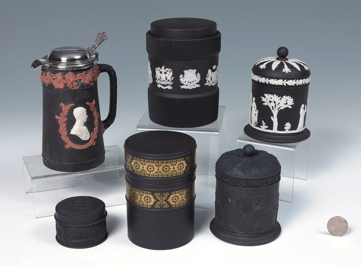 6 PIECE BLACK AND BASALT WEDGWOOD JASPERWARE: 5 covered jars and a crimson decorated syrup commemorating the royal wedding 1981 with images of Charles & Diana. Largest is 5 1/2'', smallest is the 1.5'' jar.