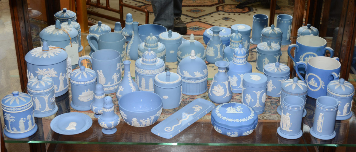 LARGE GROUP OF WEDGWOOD BLUE JASPERWARE: To include Collector Society pieces, loving cup, 11 covered jars, 2 vases, pen tray. The largest piece being the 6.5'' covered jar, the smallest are the 4'' shakers.