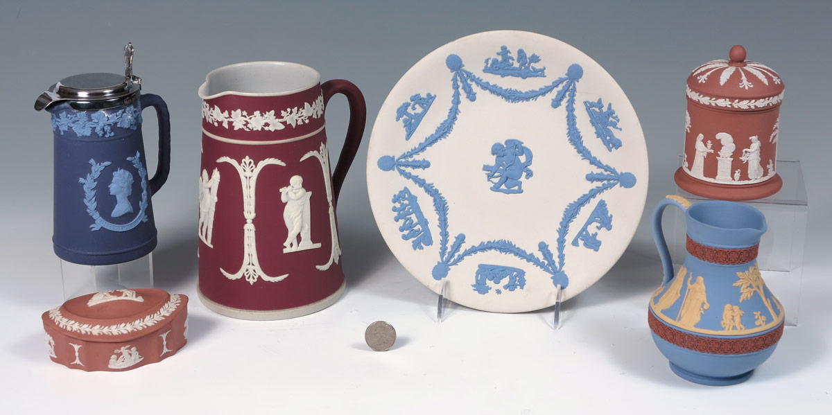 6 PIECE WEDGWOOD JASPERWARE: To include the sought after crimson pitcher, 7 1/2'', Queen Elizabeth Silver Jubilee syrup, 2 coral covered boxes, a three color pitcher and a 9'' plate.