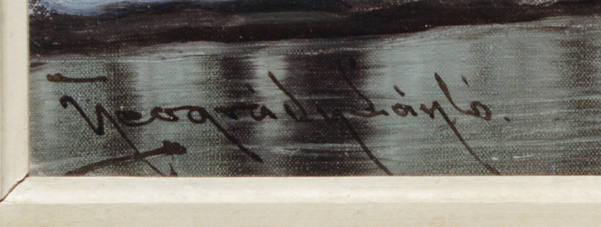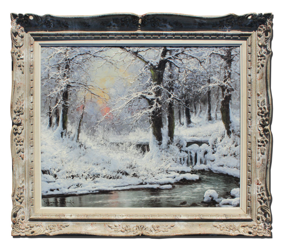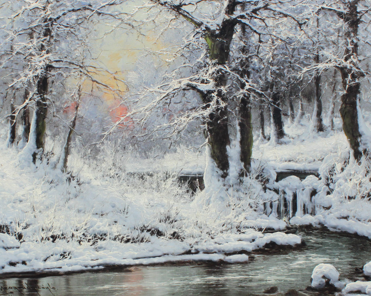 NEOGRADY, Laszlo, (Hungarian, 1896-1962): Winter Landscape with Stream, 24'' x 30'', signed lower left, encased in period carved and painted frame 32 1/2'' x 38 1/4'', copyright stamp verso with faint export? stamp verso.
