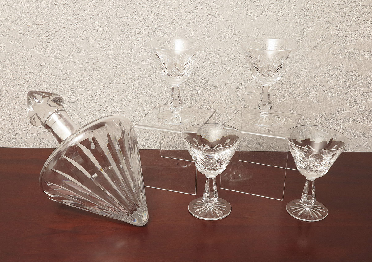 WATERFORD OMEGA TILTED DECANTER & 4 GLASSES: The tilted decanter is Omega, 11''. The 4 wine stems in a different pattern, 4 3/4''.