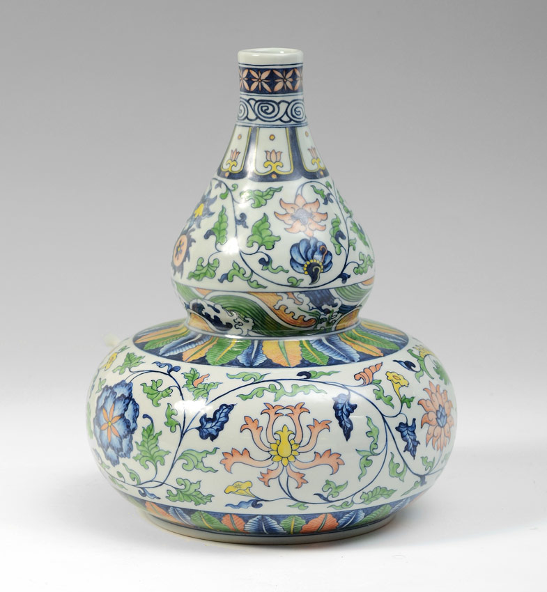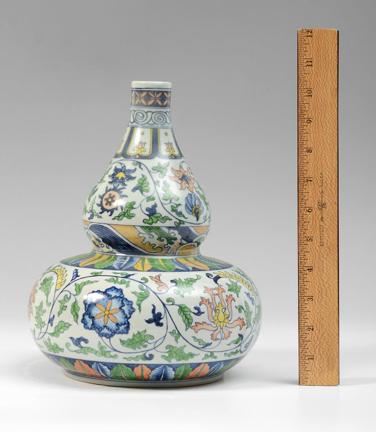 CHINESE DUCAI DOUBLE GOURD VASE: 10 1/2''h., organic design, signed in blue characters. Actual age unknown.
