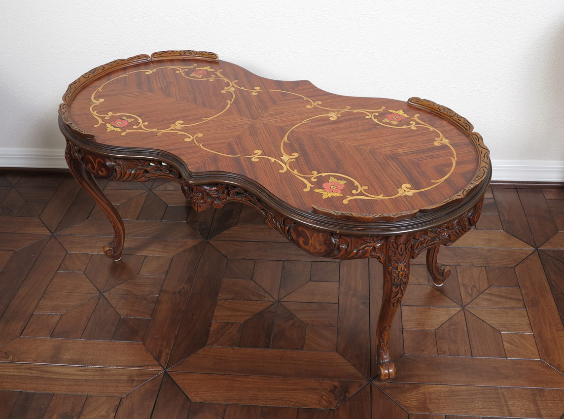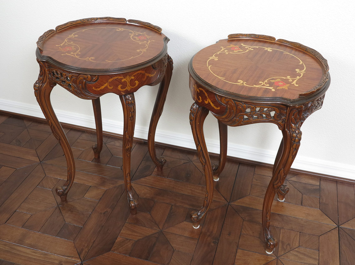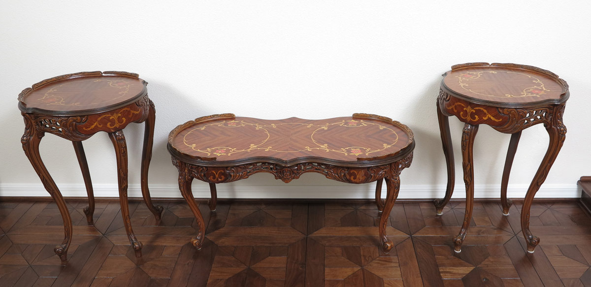 GROUP OF FRENCH STYLE MARQUETRY INLAY TABLES: Two side tables and the matching coffee table. Matchbook veneer and inlay tops, pierce carved skirts, cabriole legs. Tall tables measure 28'' x 21''. The coffee table is 18'' tall x 34''.